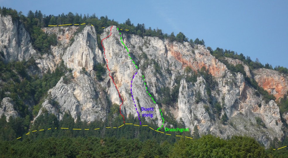 b) Mautfrei vom Parkplatz Teufelsgrat entlang der Fortstraße und an deren Ende über weg hinauf zur Hohe Wand Straße. Diese unter dem Steinschlagverbau queren, auf Pfad zum Wandfuß und diesem bis zum Einstieg, der links des mark. Einstieg des Drasgrates u. Duettsteiges liegt.