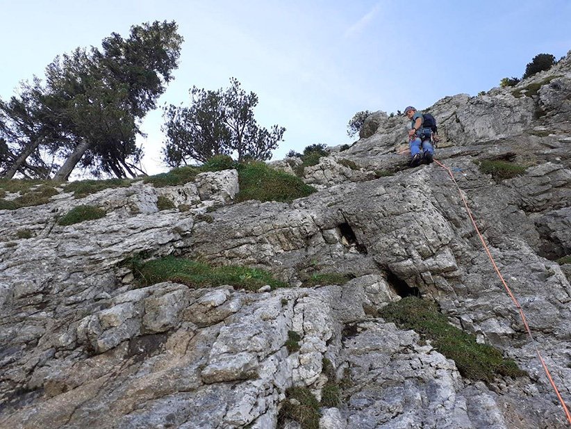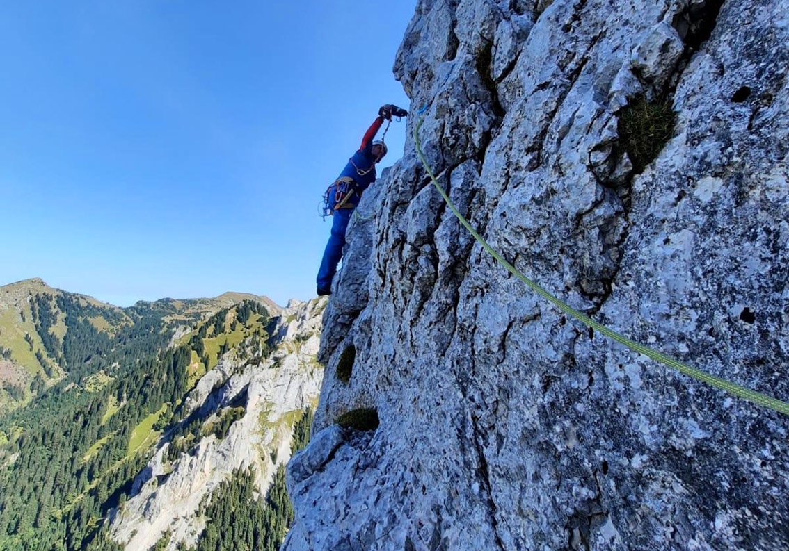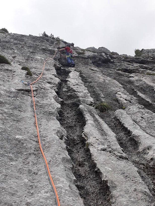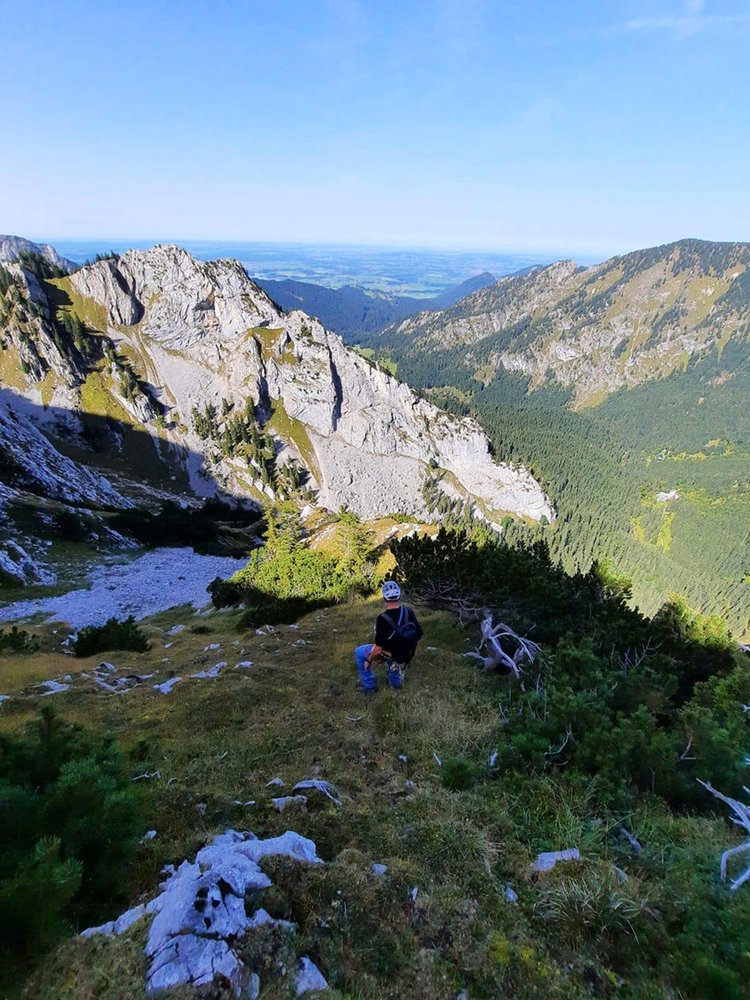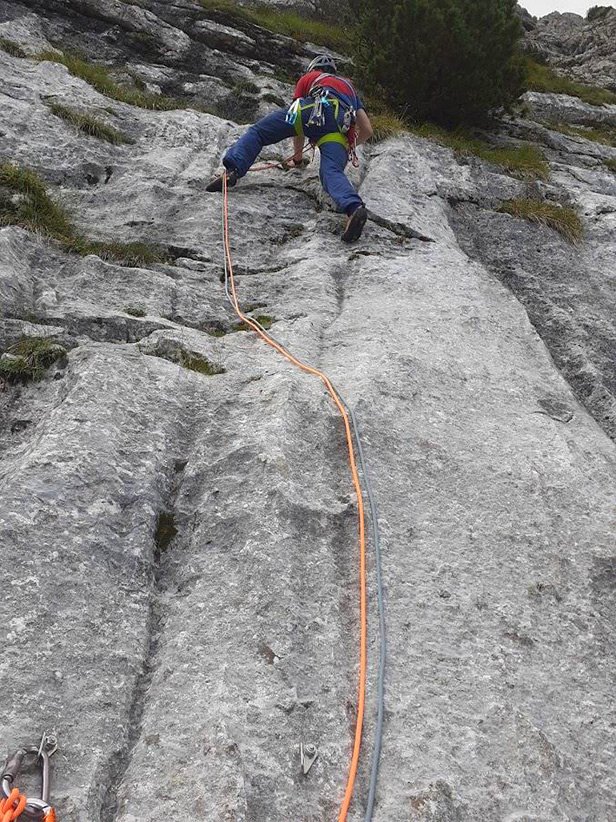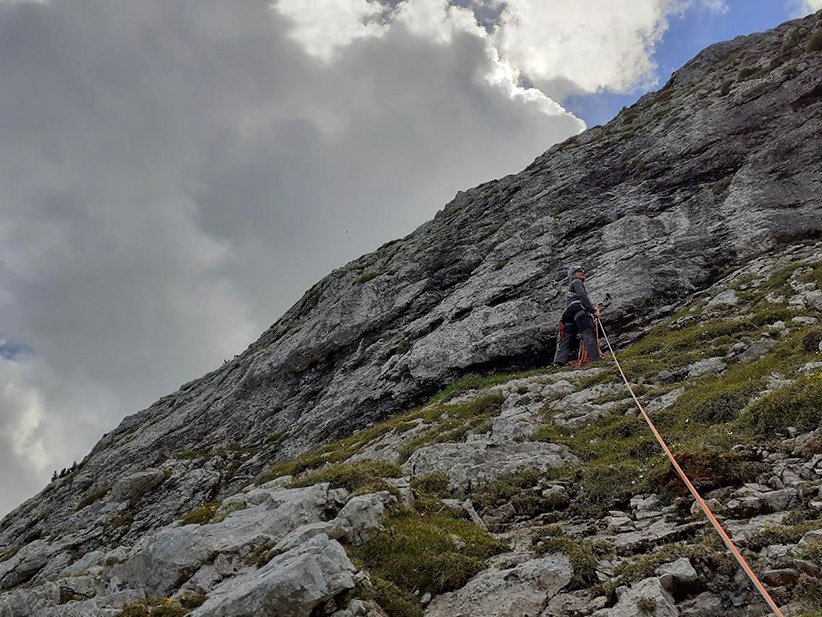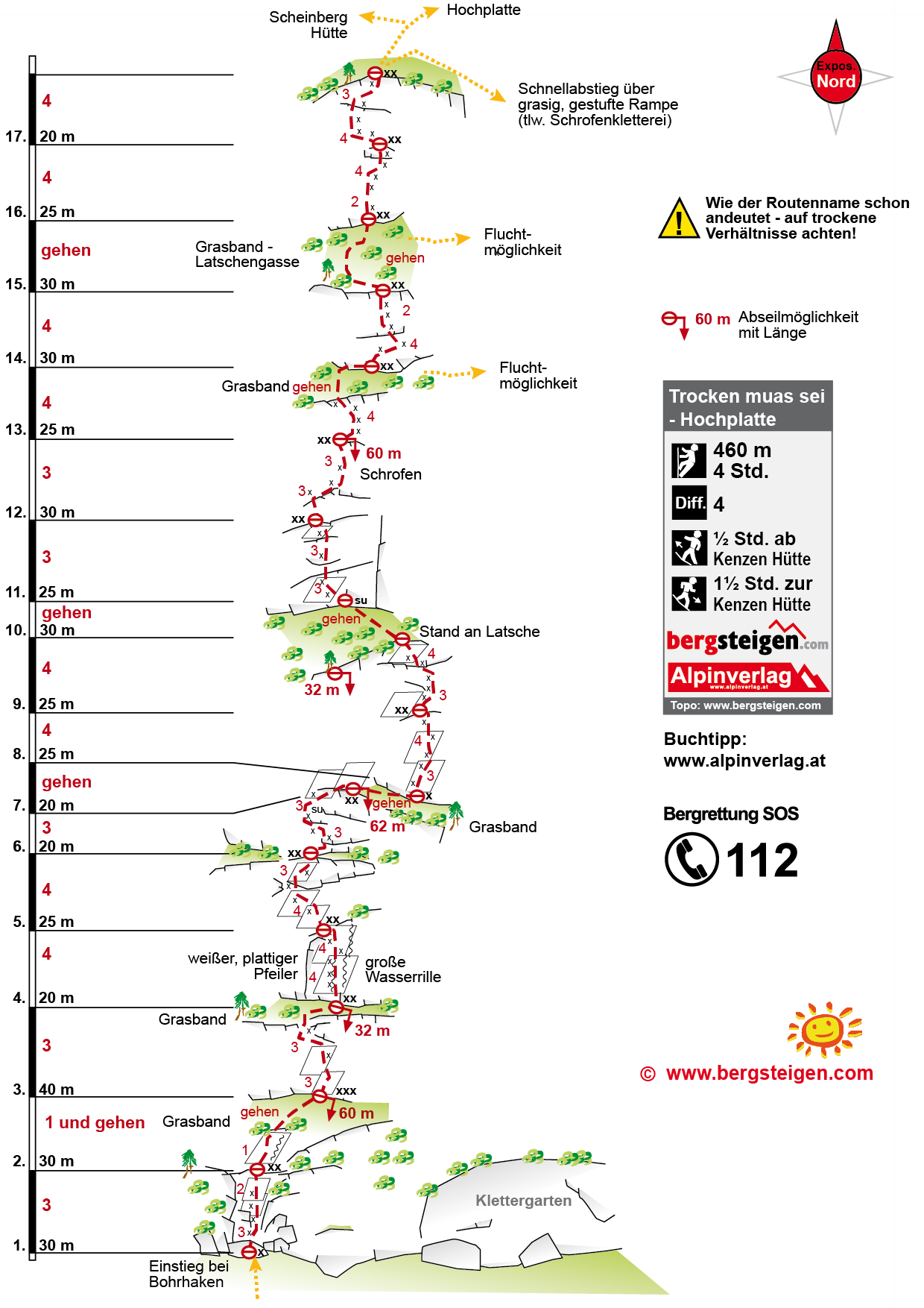 Trocken muas sei ist eine lange, leichte, gut abgesicherte Kletterei in alpinem Gelände. Der Fels ist oft sehr schön, teilweise etwas unzuverlässig, aber nie richtig brüchig. Der Name ist Programm, auf trockene Verhältnisse achten. Einige Grasbänder und ein Latschenband müssen überwunden werden, dort kaum Sicherungsmöglichkeiten.