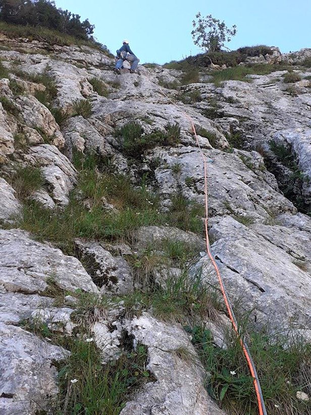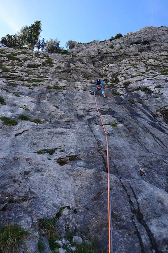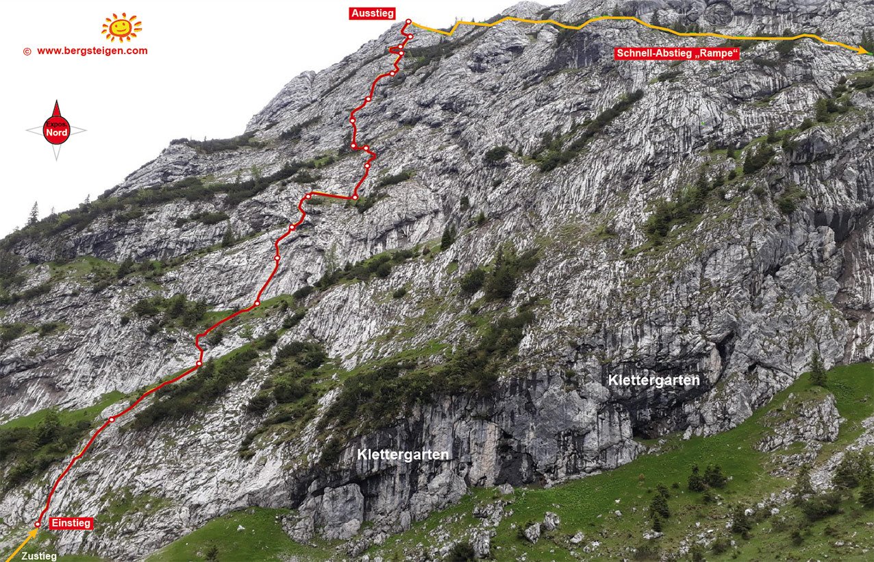 4. Abseilen (nur im Notfall zu empfehlen; siehe dazu auch Topo): vom Stand nach der 12ten Seillänge (2 Seillängen über dem Grasband mit Baum) mittels 60 m Doppelseil gut möglich. (Abseillängen 60 m, 30 m, 60 m, 30 m, 60 m). Nach der 12ten Seillänge mehrere Ausquerungsmöglichkeiten nach rechts zur Rampe wie in 1. Beschrieben.