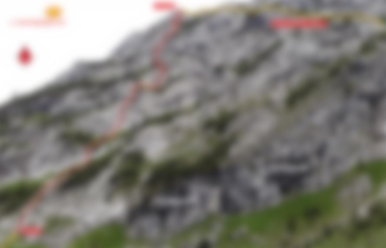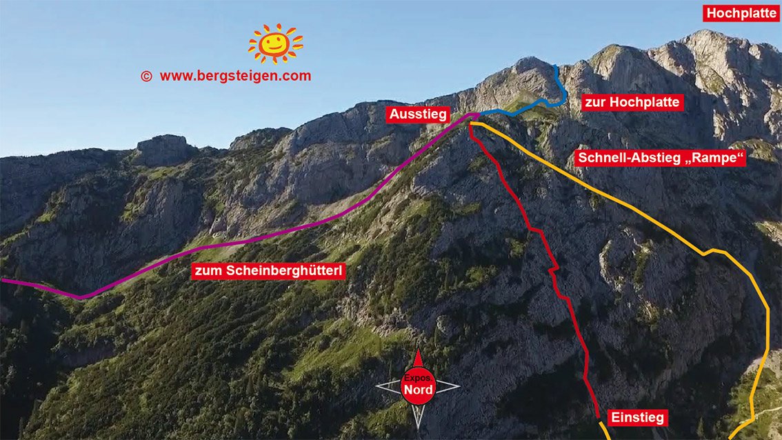 2. Möglichkeit: Vom Ausstieg, wie oben, nach rechts, dann aber aufsteigen und rechts querend Richtung Nebelreissen Pfeiler. Links von diesem in großer, schrofiger Rinne zum Wanderweg Hochplatte.