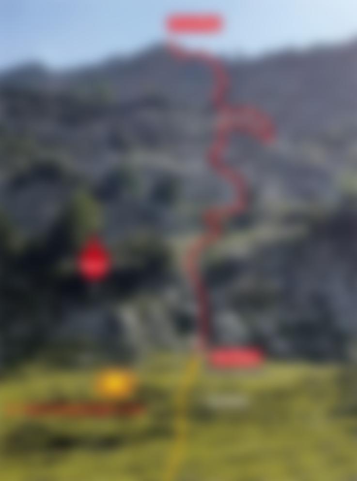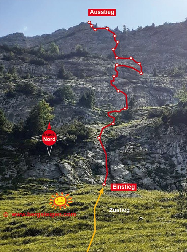 Von der Kenzen Hütte in ca. 25 - 30 Minuten. Zunächst Richtung Gasse, nach der Brücke den Aufschwung hinauf, kurz nach Beginn des Flachstücks weglos links hinauf zum Einstieg (Bohrhaken). Die Tour beginnt links von einem Klettergarten - siehe Topo und Wandbild.