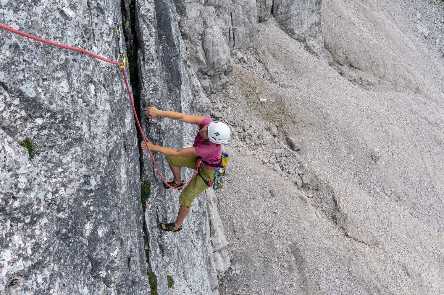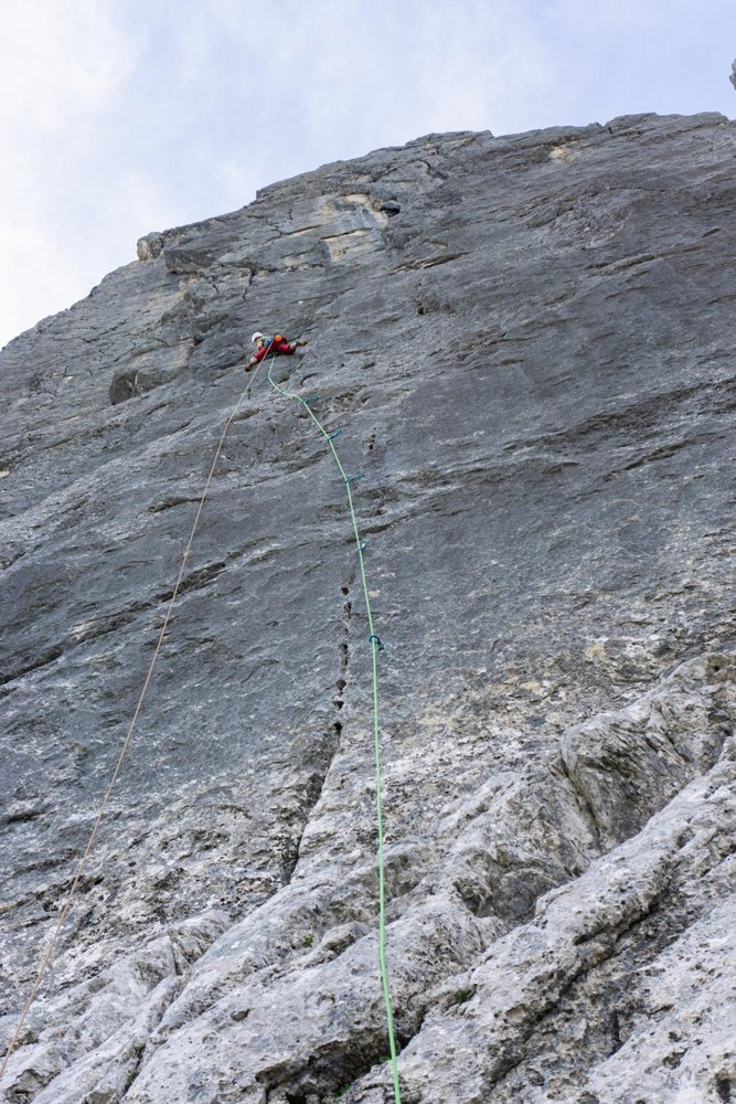 SL 1 | 7c | 30m: sehr technische Boulderpassage an Haken Nr. 2 & 3. Danach schöne Wandkletterei (~6a) bis zur kurzen, aber technischen Querung vorm Stand (~6c).