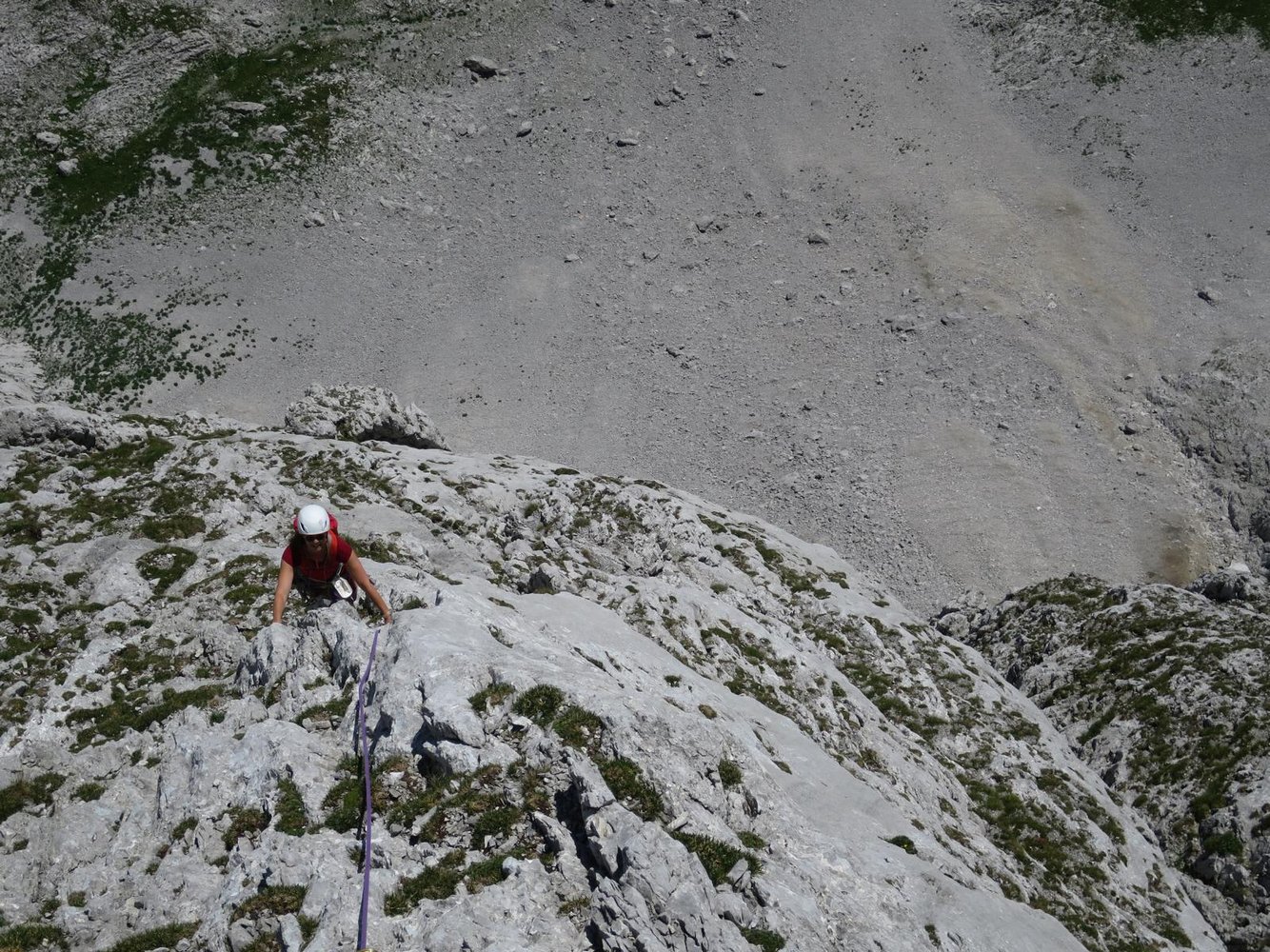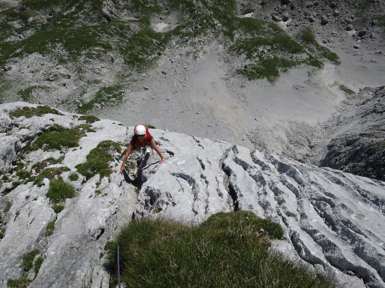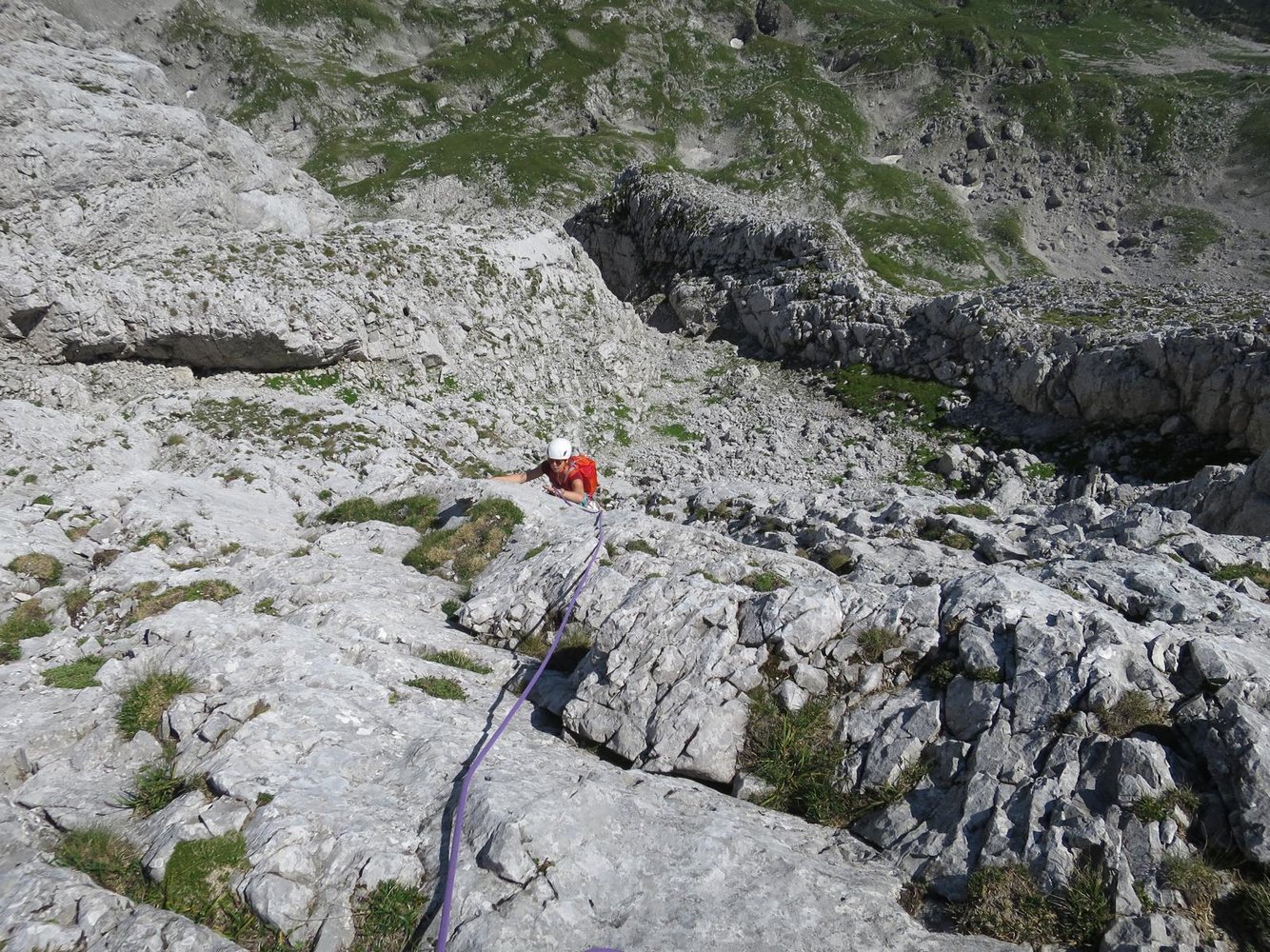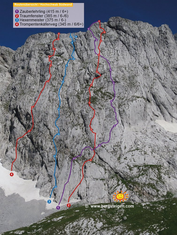 Neue Kletterroute im linken Teil der Hochschwab Südwand. Die Kletterei führt in den ersten drei Längen überwiegend an schrofig, steilen und in der zweiten Seillänge auch recht brüchigen Fels empo. Insgesamt vielleicht 70 wirklich schöne Klettermeter. Im Mittelteil werden die schönen Wasserrillen leider links liegen gelassen. Fazit: Wenn man sonst schon alles in der Südwand kennt, oder zufällig gerade vor Ort ist, muss man auch die Tour sicher machen.