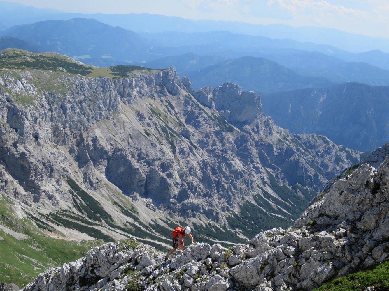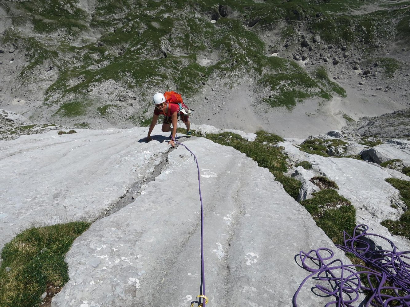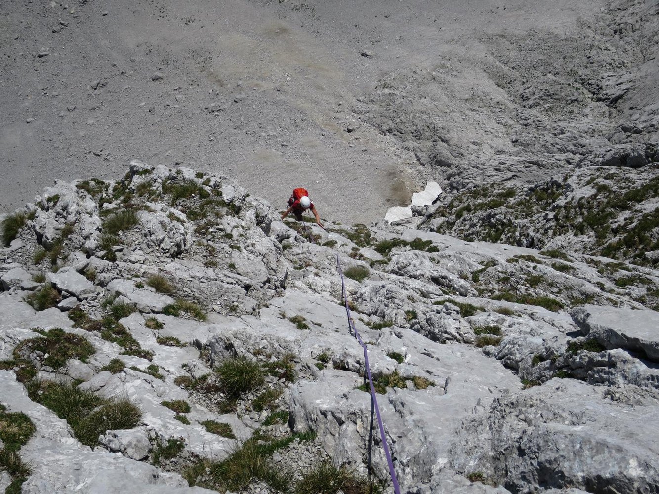 Neue Kletterroute im linken Teil der Hochschwab Südwand. Die Kletterei führt in den ersten drei Längen überwiegend an schrofig, steilen und in der zweiten Seillänge auch recht brüchigen Fels empo. Insgesamt vielleicht 70 wirklich schöne Klettermeter. Im Mittelteil werden die schönen Wasserrillen leider links liegen gelassen. Fazit: Wenn man sonst schon alles in der Südwand kennt, oder zufällig gerade vor Ort ist, muss man auch die Tour sicher machen.