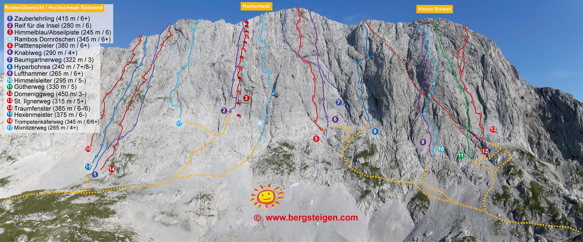 Einstieg weit links der Südwand bei der Platte welche ganz tief ins Schuttkar reicht. Steigspuren und Steinmänner. Der Einstieg ist 50 Meter links überhalb der Routen Hexenmeister und Zauberlehrling bei einem dreieckigen, plattigigen Vorbau rechts von einer Rinne.