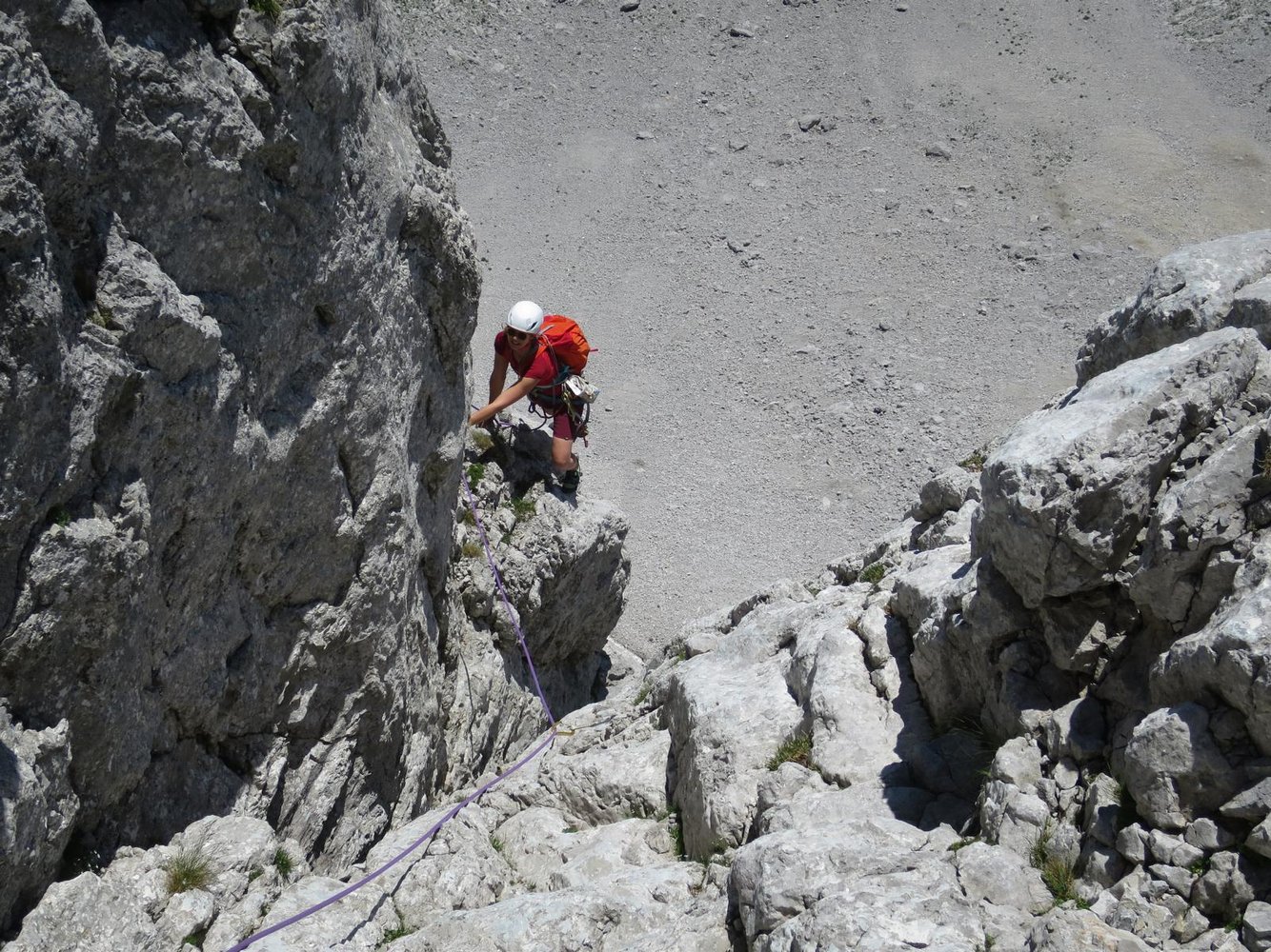 Mind. 65 m Doppel- od. Einfachseil, Kletterausrüstung und Helm.