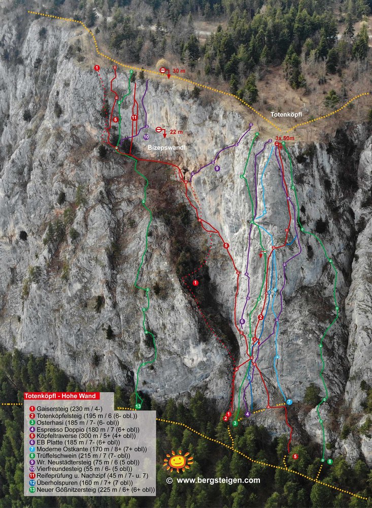 Vom Parkplatz leicht rechtshaltend zum Wandfusssteig (blaue Markierung) aufsteigen und weiter nach rechts bis zu den Einstiegen unter dem mark. Pfeiler des Totenköpfls, noch 50 m weiter (vorbei ein der Einseillängentour Rutschpartie) zum Einstieg.