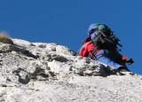 Der Fels ist z.t. brüchig, es bieten sich aber für diesen Schwierigkeitsgrad ausreichend Sicherungsmöglichkeiten (Sanduhren, Köpfl, Latschen und manch noch brauchbarer Haken, auch einige sicherlich unbrauchbare Bandschlingen bzw. Reepschnüre! (Okt 2003)). Helm , ein KK - Grundsortiment, einige Bandschlingen und ein oder die andere Reepschnur (zum abseilen/dortlassen) sind aber auf jeden Fall notwendig.