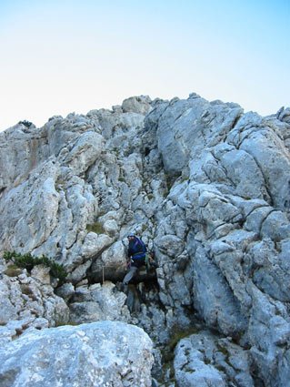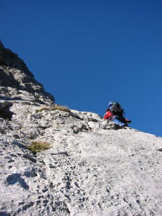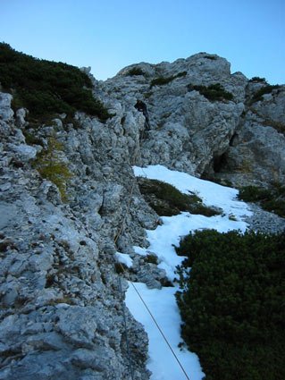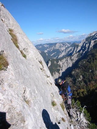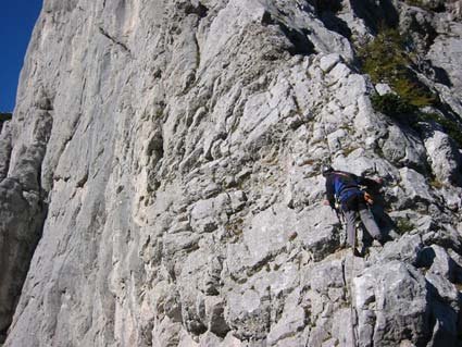 Der Fels ist z.t. brüchig, es bieten sich aber für diesen Schwierigkeitsgrad ausreichend Sicherungsmöglichkeiten (Sanduhren, Köpfl, Latschen und manch noch brauchbarer Haken, auch einige sicherlich unbrauchbare Bandschlingen bzw. Reepschnüre! (Okt 2003)). Helm , ein KK - Grundsortiment, einige Bandschlingen und ein oder die andere Reepschnur (zum abseilen/dortlassen) sind aber auf jeden Fall notwendig.
