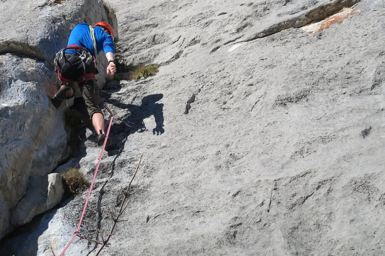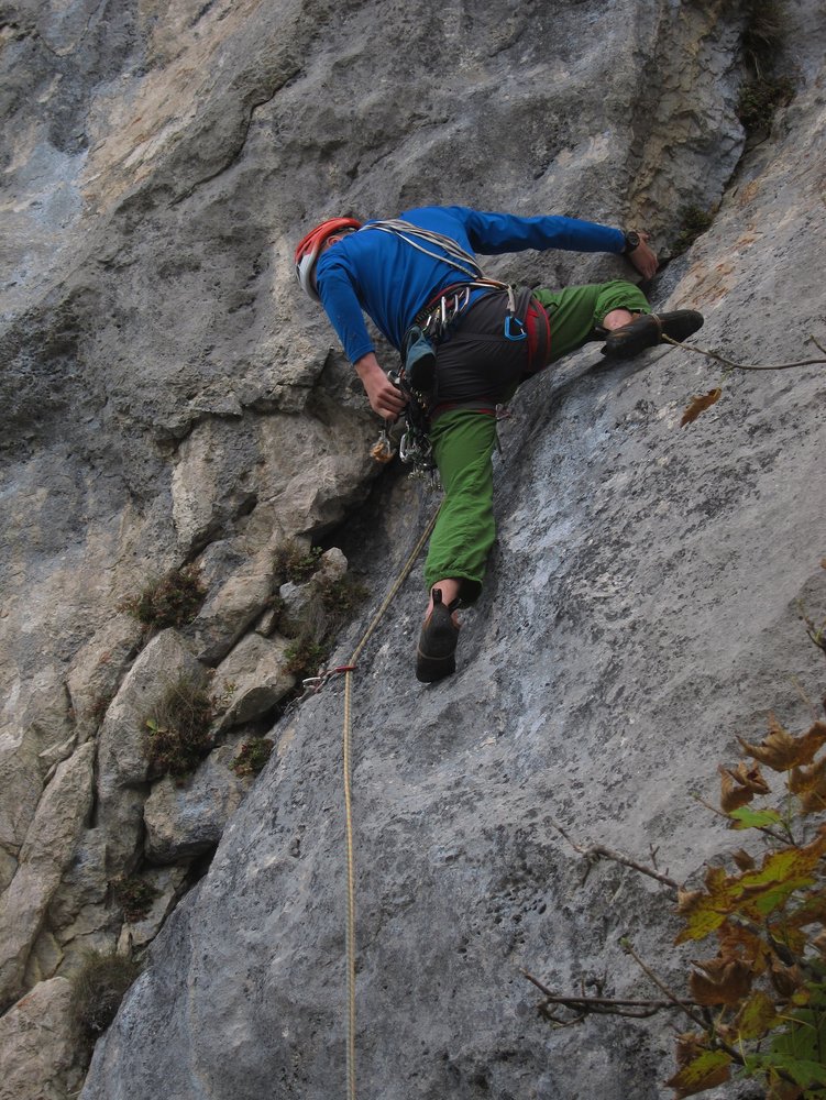 In den ersten beiden Seillängen noch etwas ungeputzt und dadurch stellenweise grasig bzw. splittrig, in den darauffolgenden Seillängen dann genussreiche gut abgesicherte Platten- und Kantenkletterei in festem Fels. In der letzten Seillänge steile, kompakte Verschneidungskletterei.