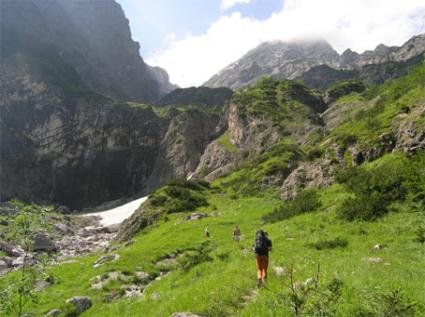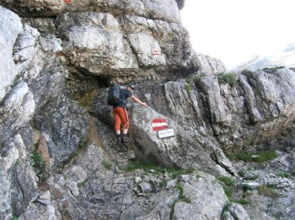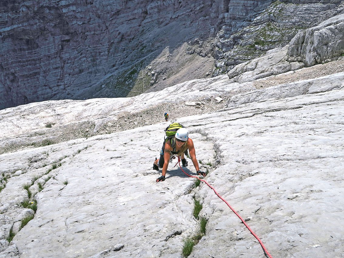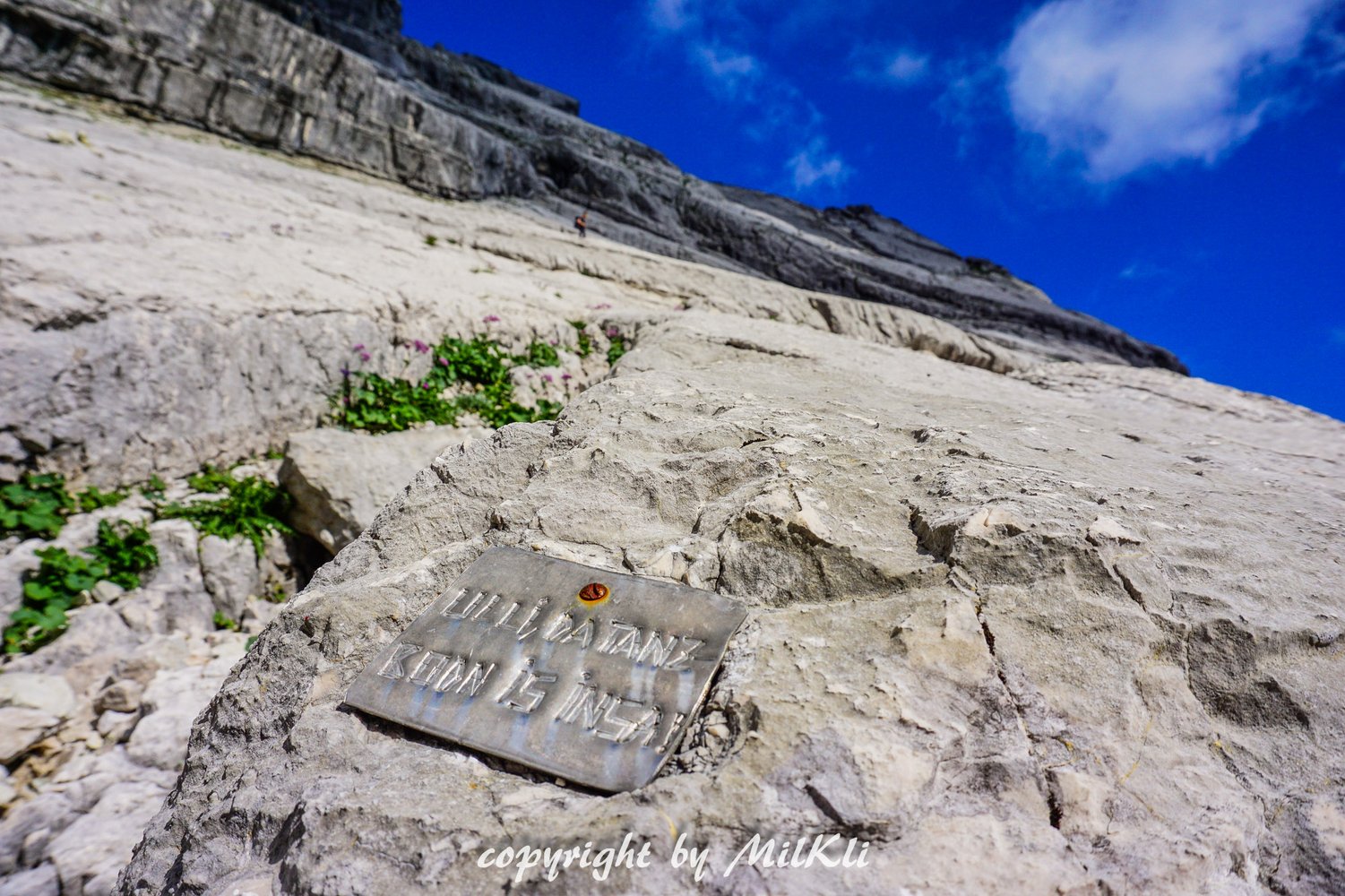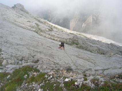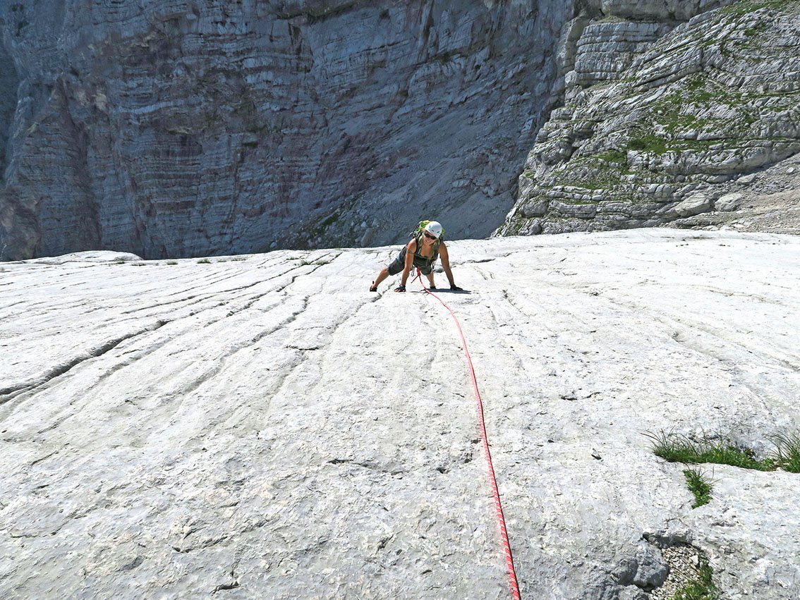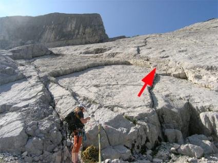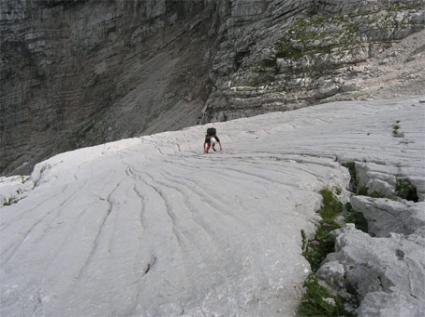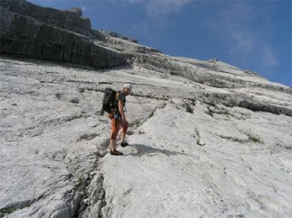 Man könnte auch über die Tour abseilen, dies ist aber nur im Notfall zu empfehlen (Steinschlag, der in solchen Platten sehr gefährlich ist), da der Fußabstieg deutlich kürzer ist.