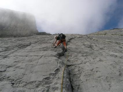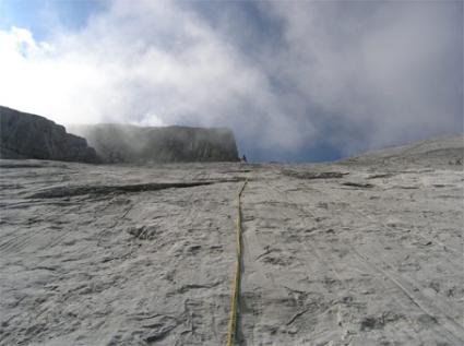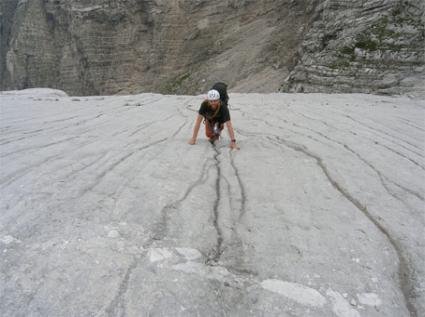Stände fast immer gebohrt (ausser man steht auf einem wirklich großen Plateau), bei den schweren Stellen meist ein Zwischenhaken. In den leichten Plattenlängen steckt nichts und man kann in den glatten Platten auch keine Keile anbringen. Vor allem die Punktmarkierung ist bei der Wegfindung in den Riesenplatten sehr hilfreich.