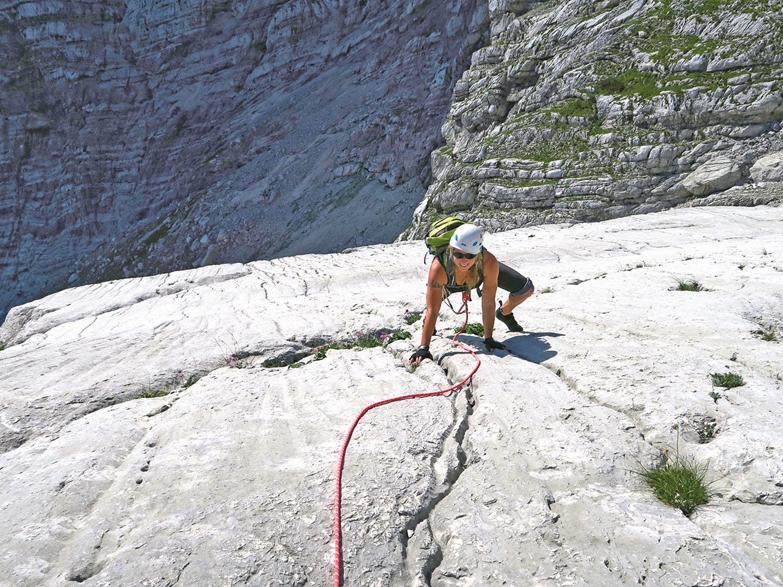 Helm, 50m Seil und Friend Nr. 2, für den Abstieg sollte man die Schuhe mitnehmen.