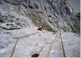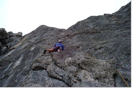 Doppelseil 50 m, 12 Expressschlingen, einige Bandschlingen, (KK-Sortiment inkl. Friends für den Weiterweg über den Stiebritzpfeiler) und Helm.