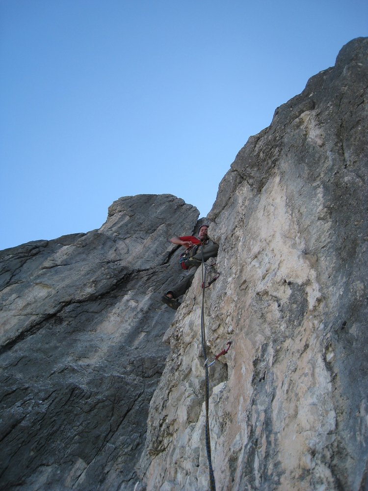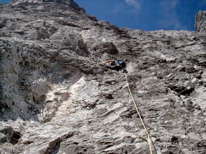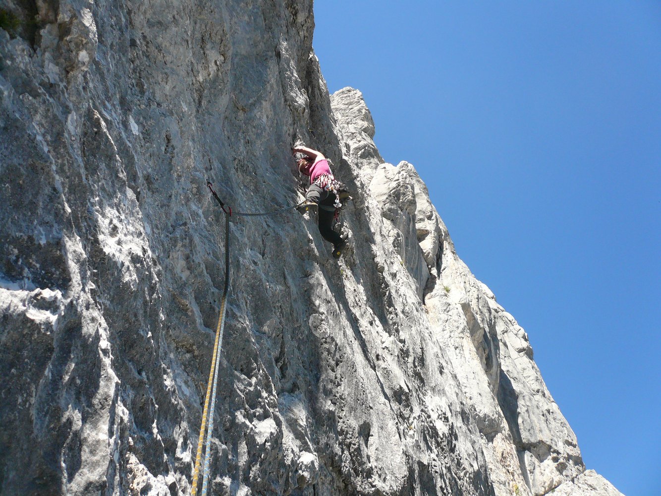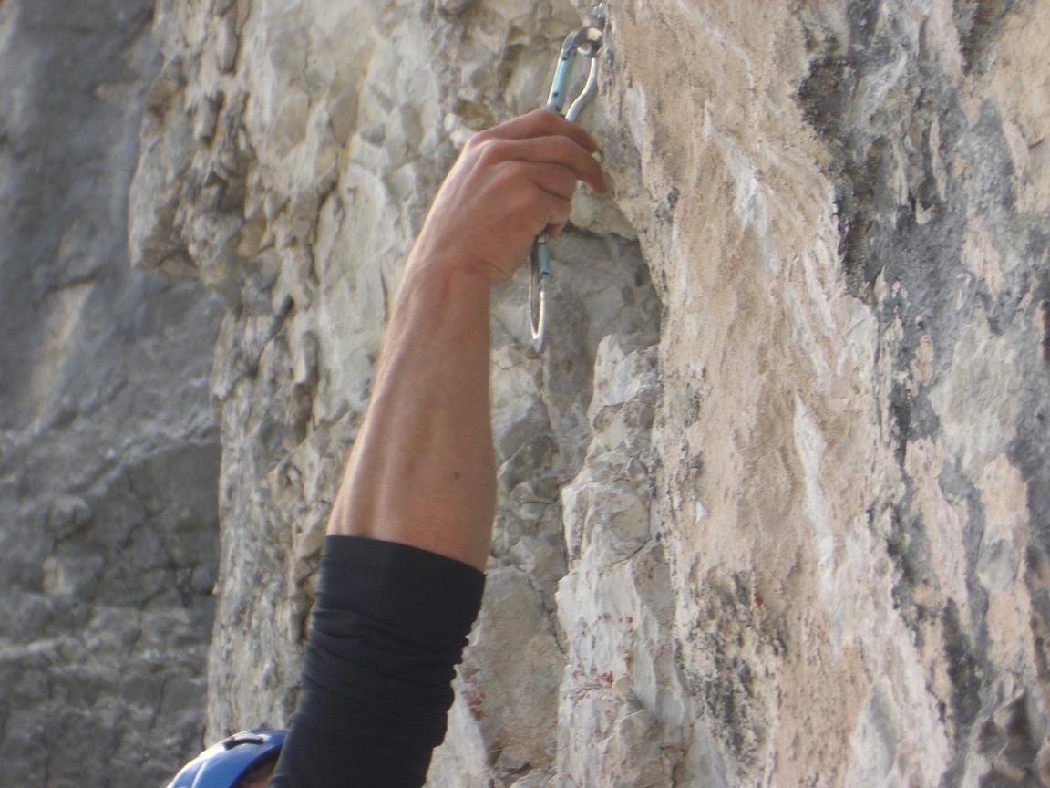 Die Absicherung ist in den schwereren SL sehr gut, aber man sollte im 5+ Gelände auch weitere Abstände vertragen, auch 6+ Stellen müssen geklettert werden. An den Standplätzen stecken jeweils ein Bohrhaken und ein Klebehaken.