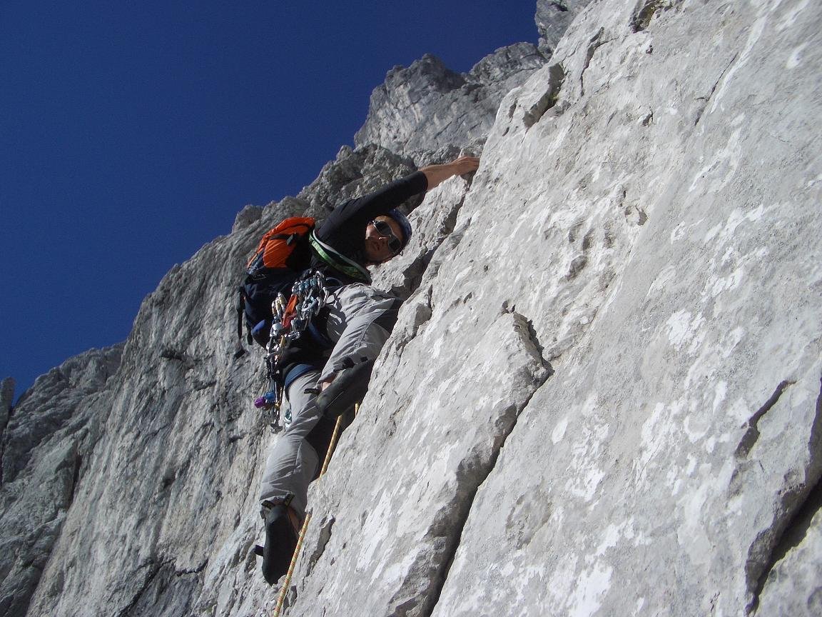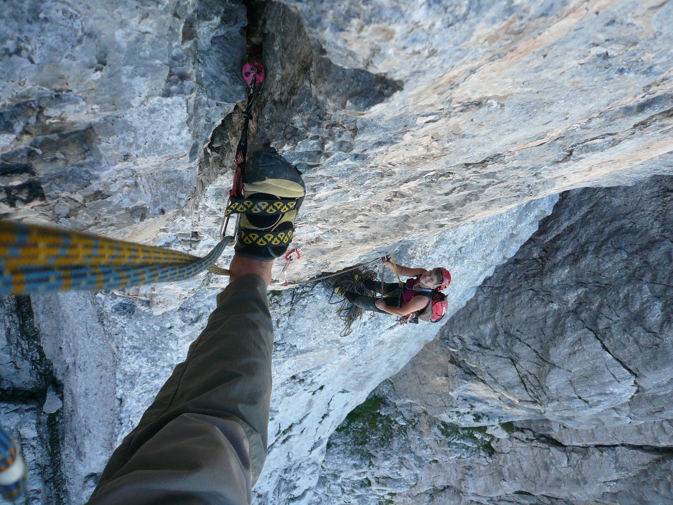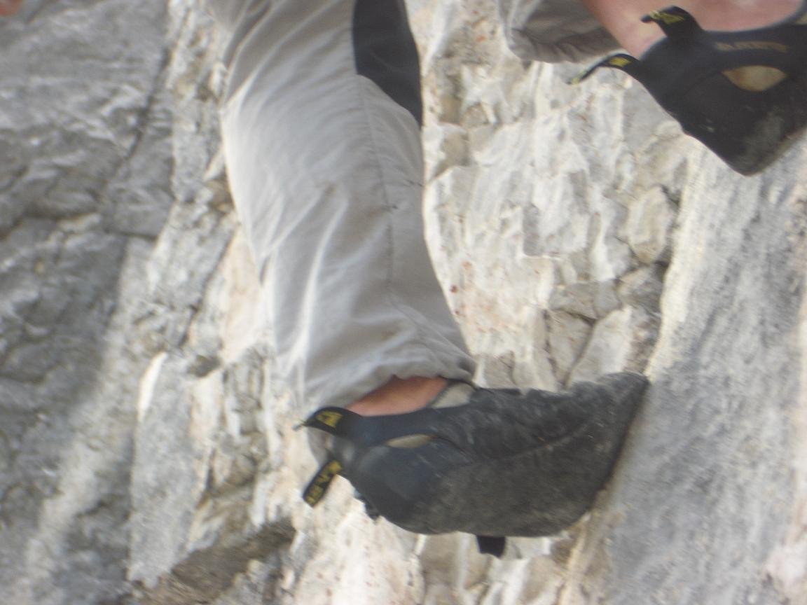 Die Absicherung ist in den schwereren SL sehr gut, aber man sollte im 5+ Gelände auch weitere Abstände vertragen, auch 6+ Stellen müssen geklettert werden. An den Standplätzen stecken jeweils ein Bohrhaken und ein Klebehaken.