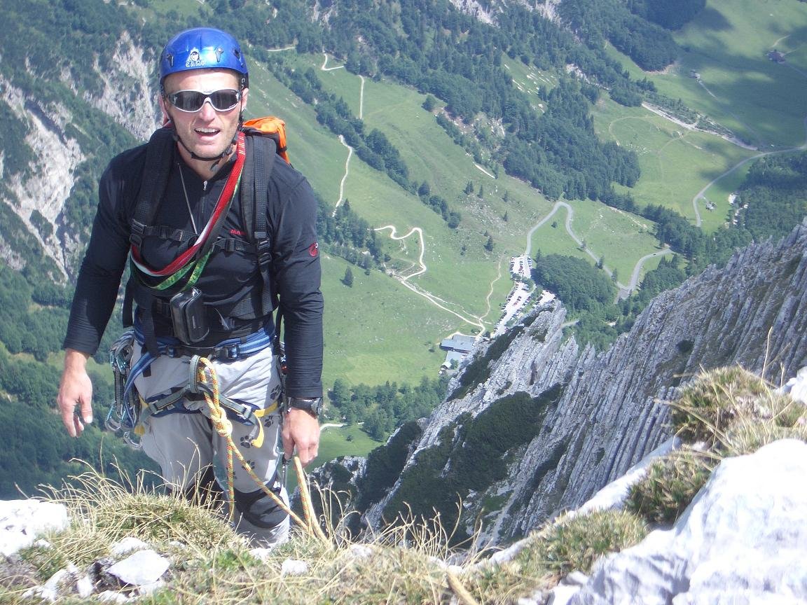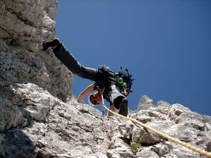 Über den "Führerweg" abkletternd (II-III) und abseilend zurück zum Stripsenjochhaus. Teilweise mit Steinmännern und Farbpunkten markiert. Abseilstellen sind mit Klebehaken (mit Ring) versehen.