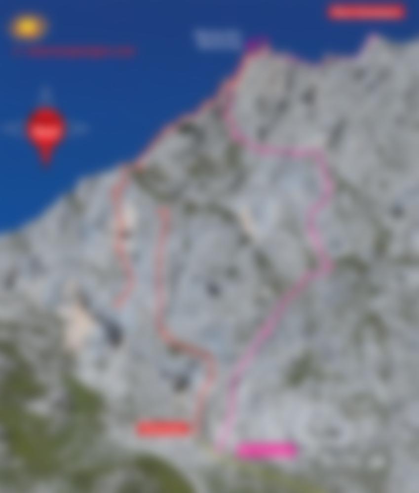 Siehe Topo: 10 Seillängen, immer den goldenen Bohrhaken folgen. Achtung: Nach der zweiten Seillänge 25 Meter zum Beginn der dritten Seillänge abseilen!