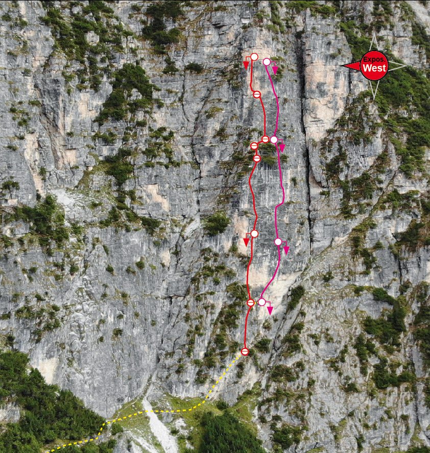 Dem Wanderweg in Richtung St. Magdalena folgen, die kleine Kapelle wird in ca. einer Dreiviertelstunde erreicht. Von der Kapelle rechtshaltend über die Wiese zu den schon sichtbaren Felsen (Klettergarten). Am Wandfuß rechtshaltend auf einem teilweise ausgesetzten Pfad entlang. Man kommt zum Pfeiler und steigt auf einem ansteigenden Felsband zum Standplatz bei einem Bohrhaken.