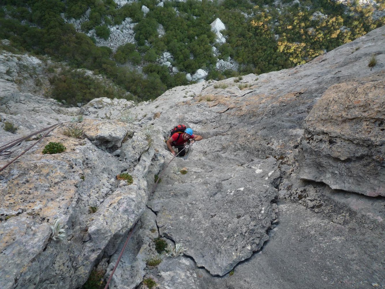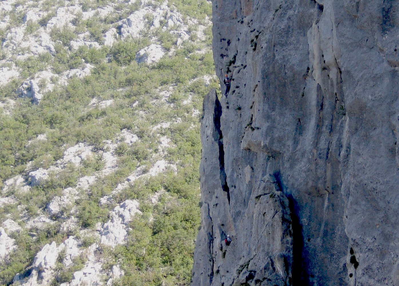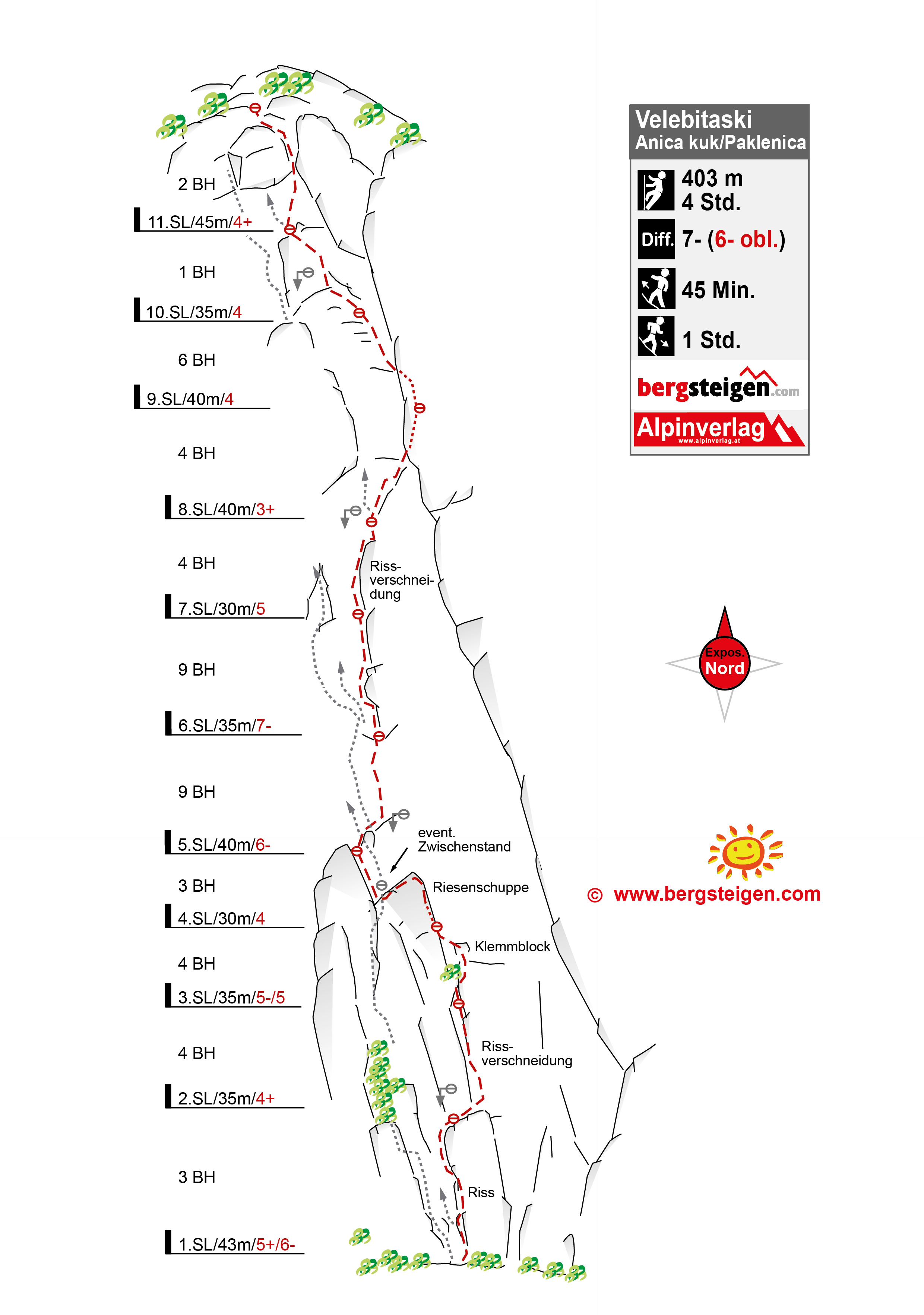 Großartige, sehr beliebte und auch bereits etwas abgekletterte Linie die zur Anića kuk – Trilogie (Velebitaški – Klin – Mosoraški) zählt. Die Route bietet sehr abwechslungsreiche Klettertei an Rissen und Platten im zentralen Teil der Nordwand. Sicher eine der beliebeste Mehrseillängen Routen im Velebit / Paklenica.