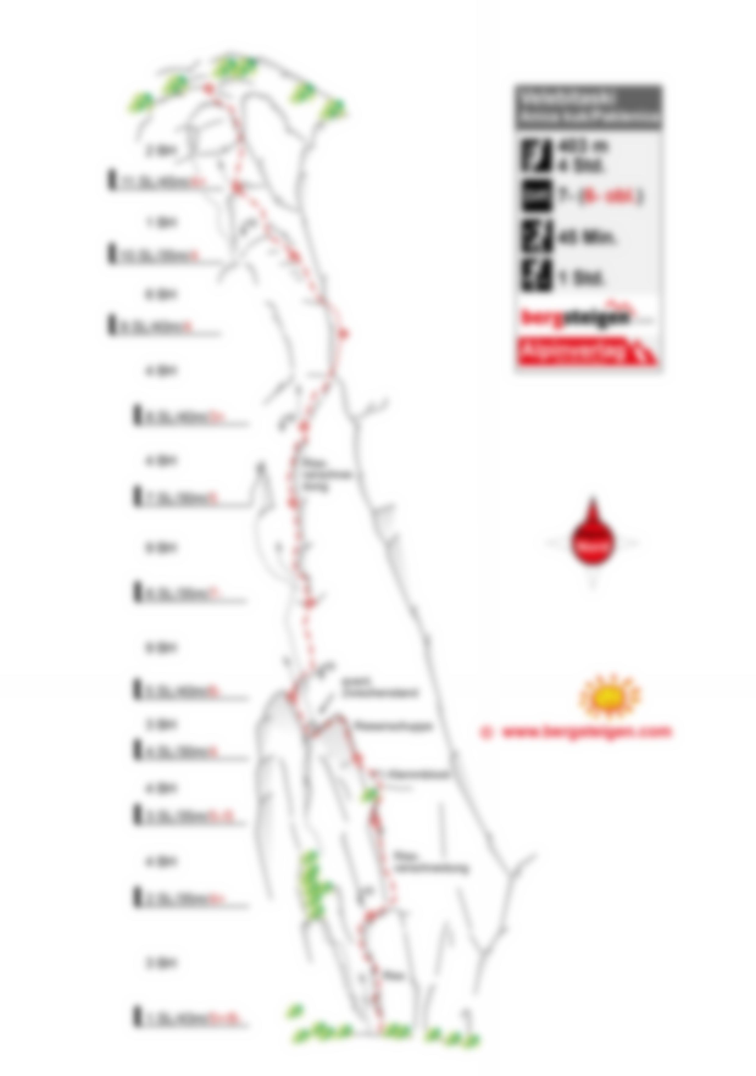 Vom Gipfel auf dem Normalweg (rote Punkte) zurück in die Schlucht und zum Ausgangspunkt.