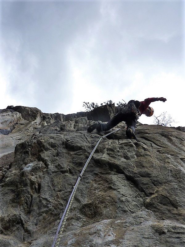 Abseilen über den Humuspfeiler. Vom Ausstieg etwa 20m auf Wegspuren zu Baum mit Bandschlinge und Rapidglied. Von diesem 10m zum Stand direkt UNTERHALB der Felskante abseilen (den Bohrhakenstand oberhalb der Kante lässt man am besten links liegen). Von dort 2x50m über den Humuspfeiler abseilen.