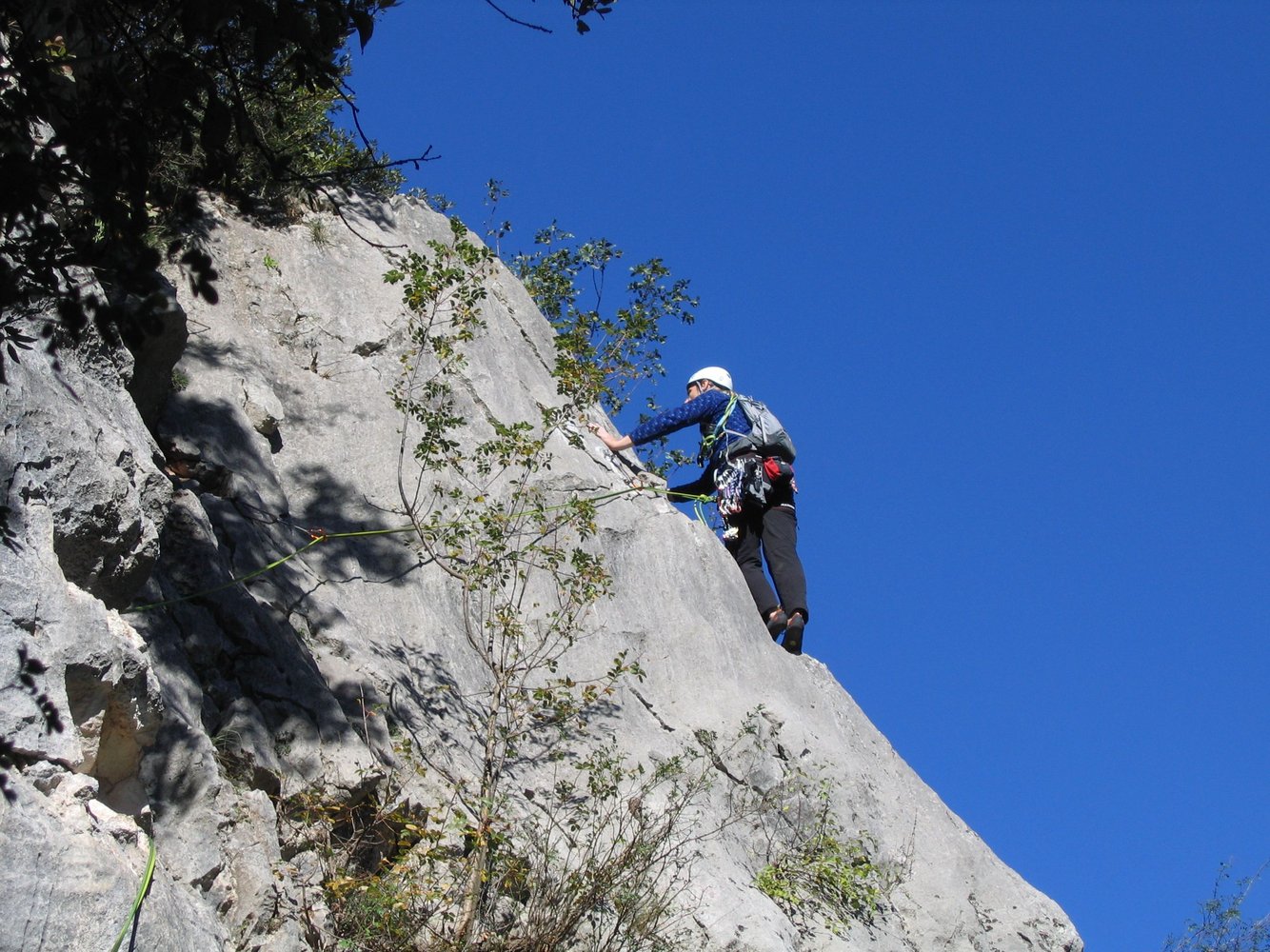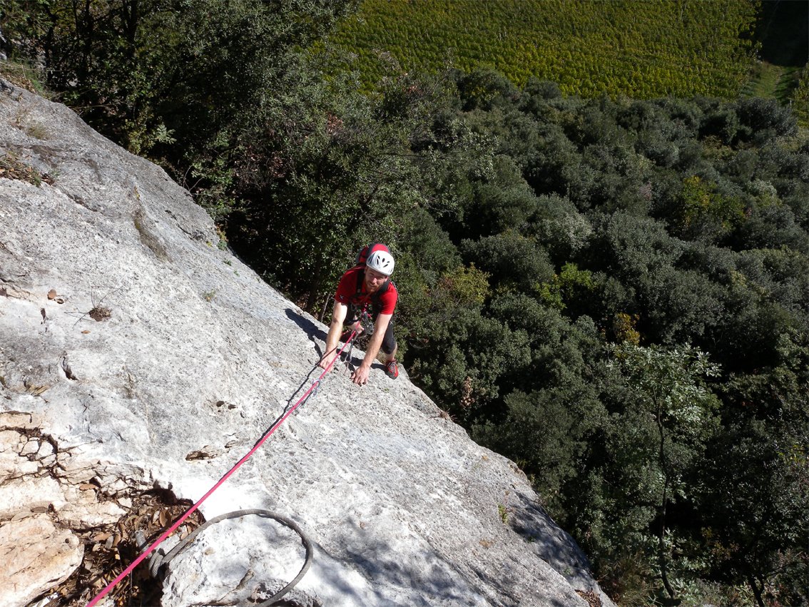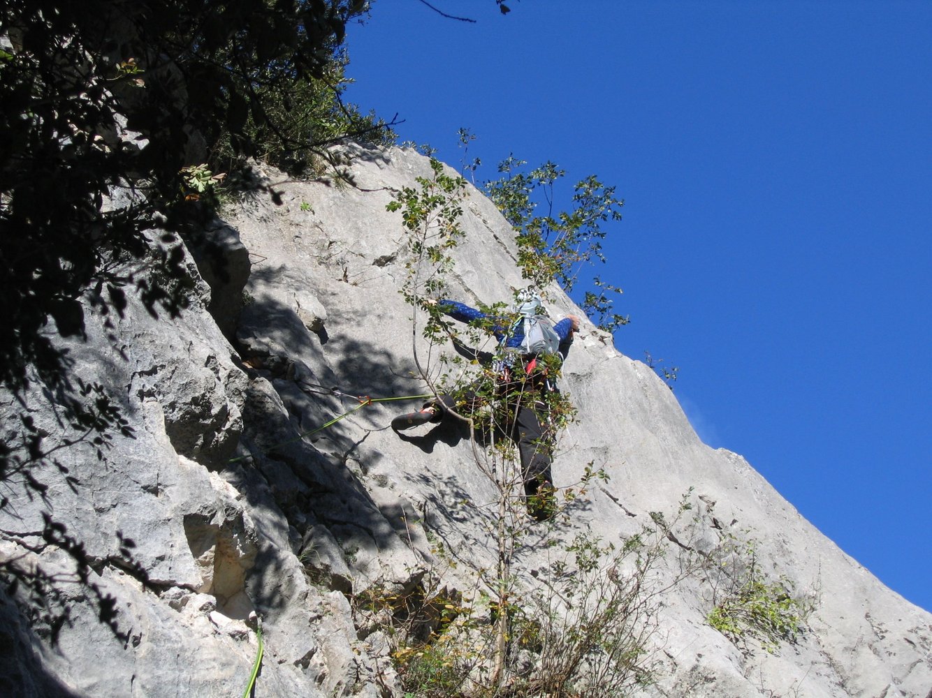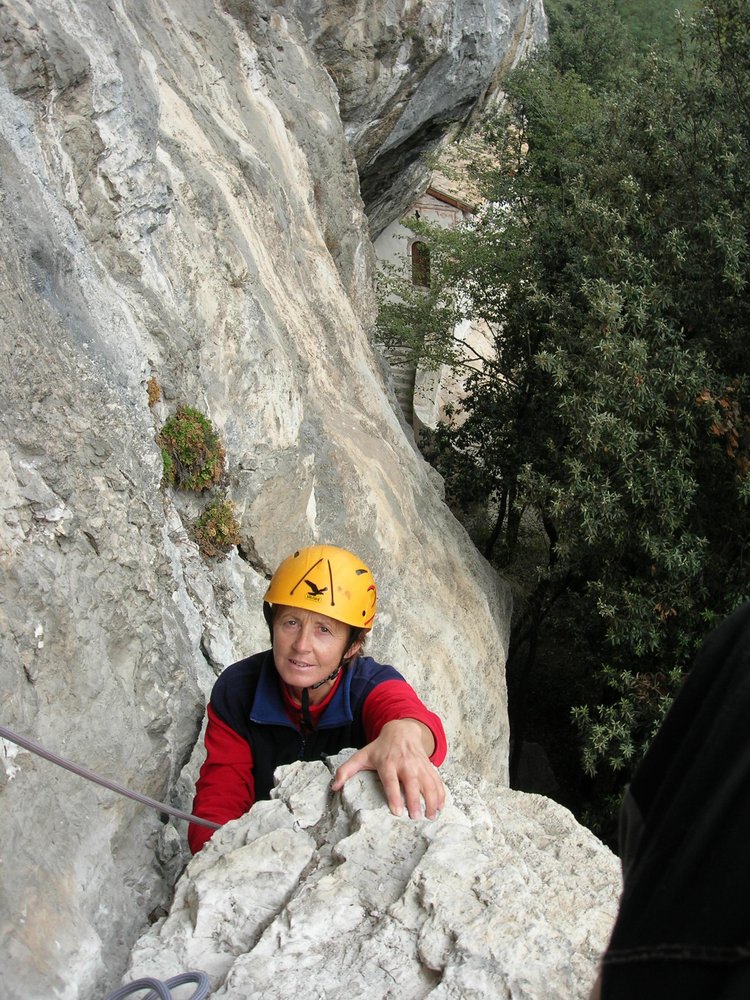 Sehr schöne, schon etwas abgekletterte Einsteigertour links der Einsiedelei Ermo di San Paolo. Die Tour ist primär mit Sanduhrschlingen gesichert, teilweise in recht engem Abstand. Die Erstbegeher haben eine schöne Linie durch die mit viel Büschen überzogene Wand gelegt.