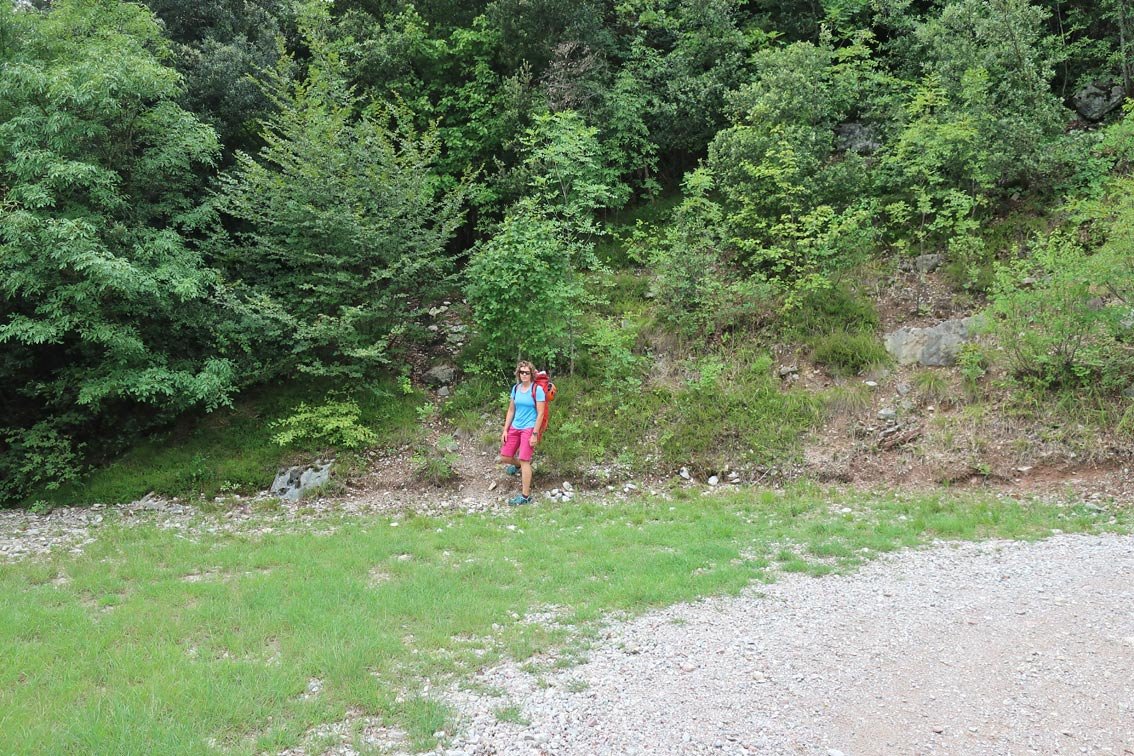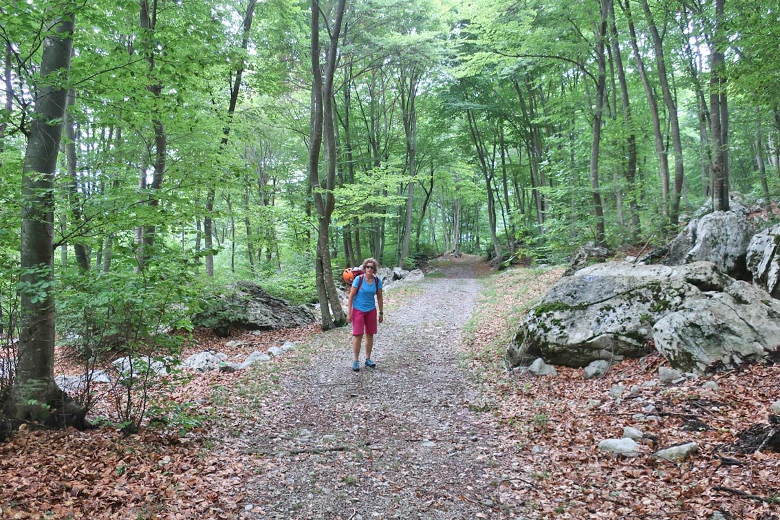 Vom Ausstieg durch den Wald zu markiertem Forstweg und auf dem markierten Wanderweg nach Pieatrramurataabsteigen.