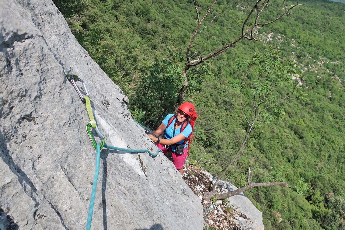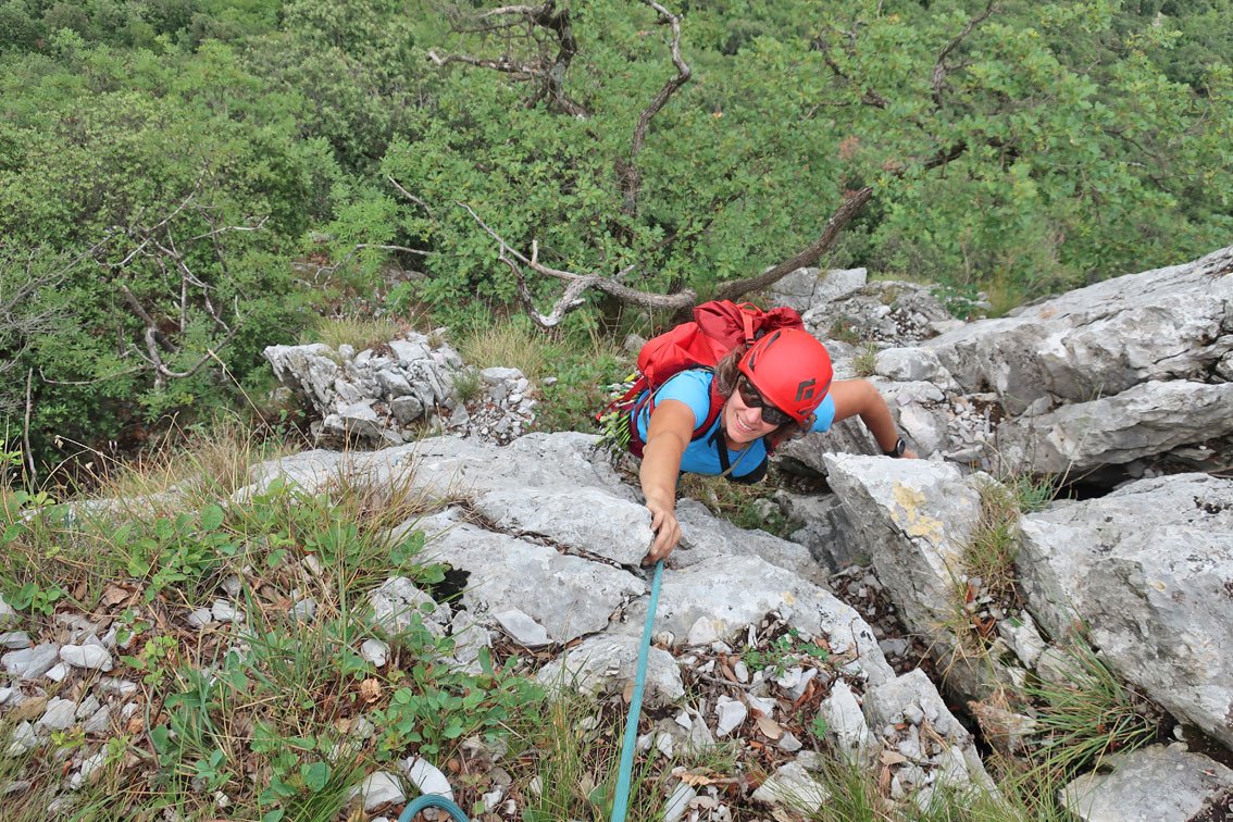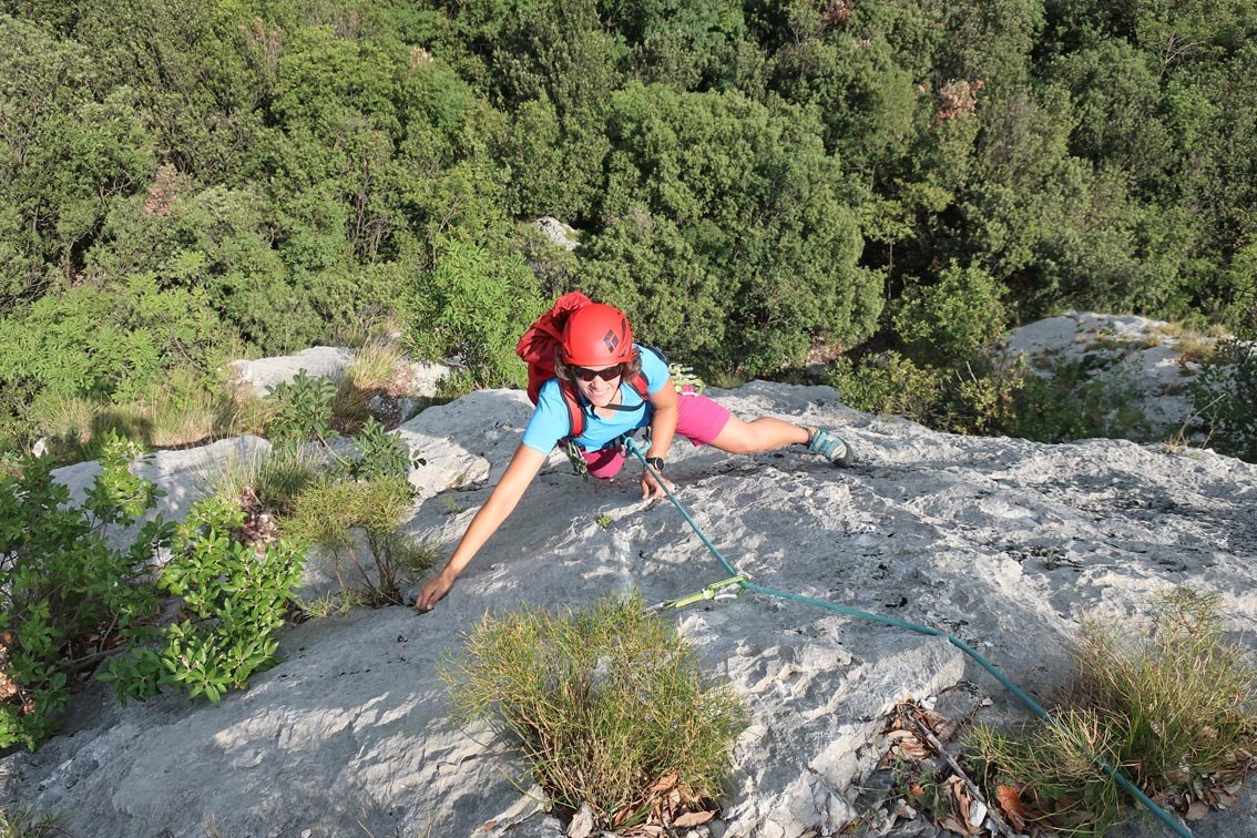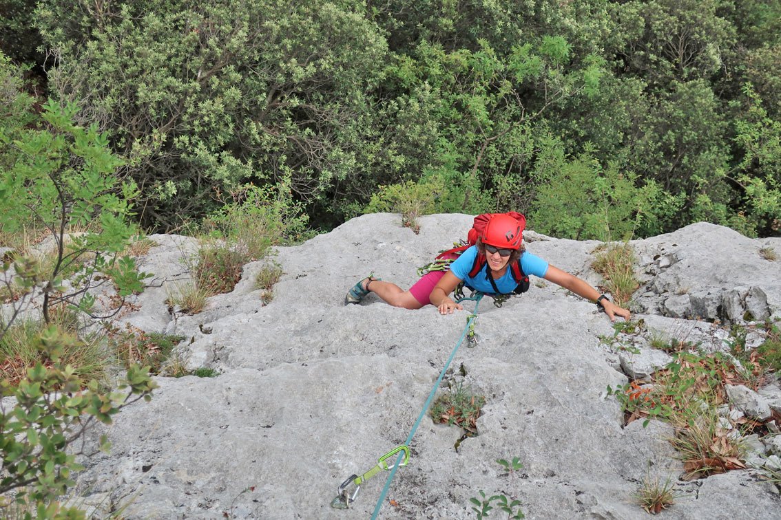 1 x 60 m Einfachseil, 12 Expressschlingen und Helm.