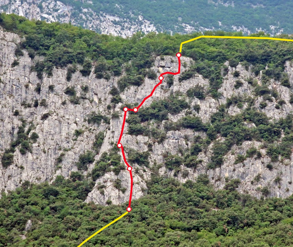 Siehe Topo. Die erste und vorletzte Seillänge sind etwas schwerer.