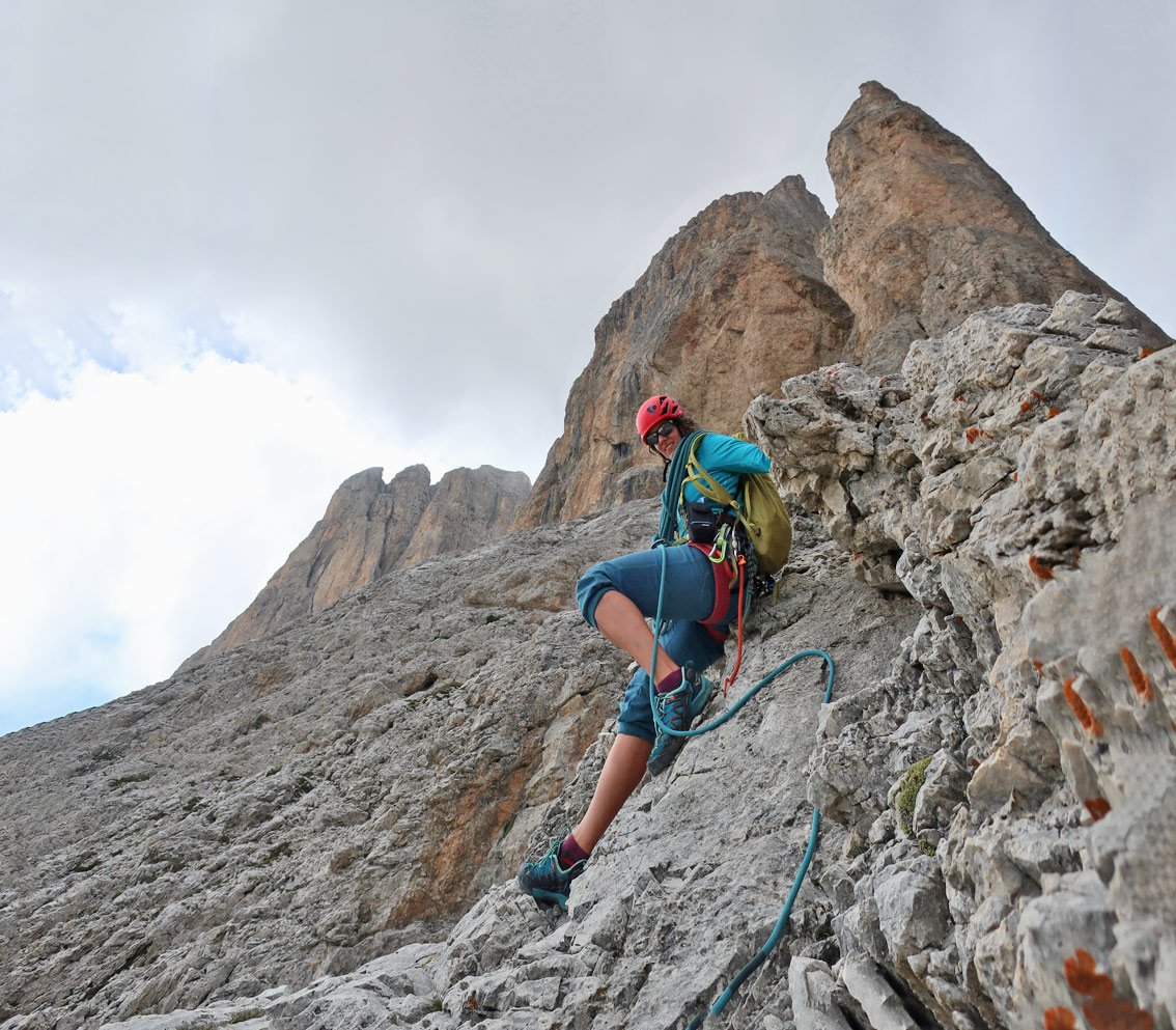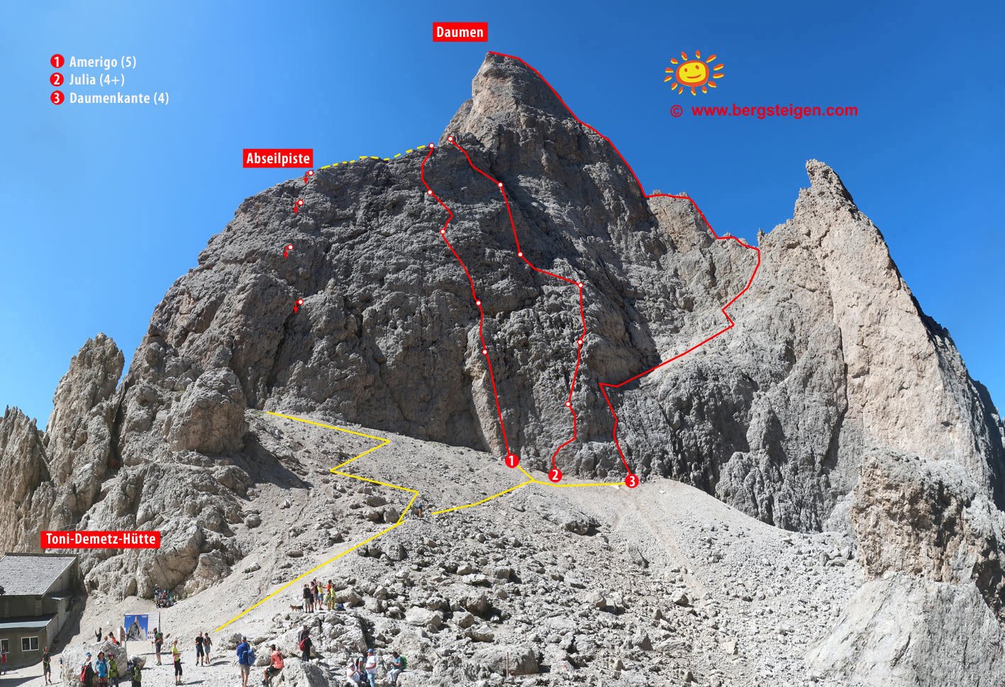 Von der Talstation auf dem Wanderweg unterhalb der Seilbahn bis zur Toni-Demetz-Hütte (505 Hm/1¼ Std.). Hinter der Hütte in wenigen Schritten zum Einstieg bei einem markanten Pfeiler.