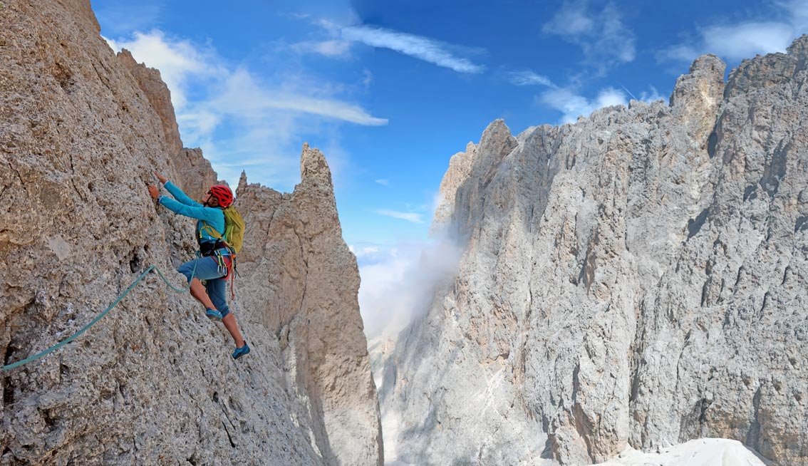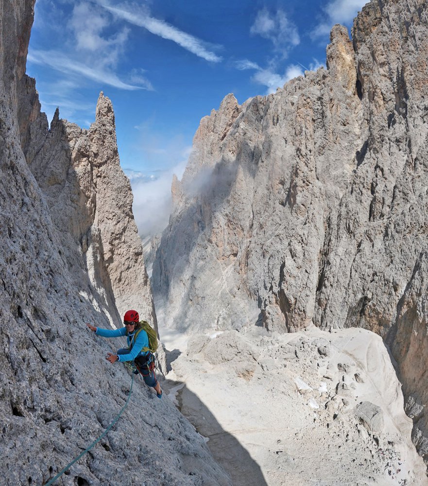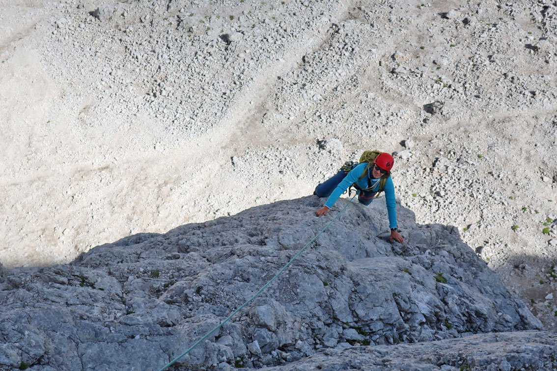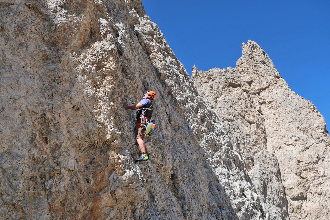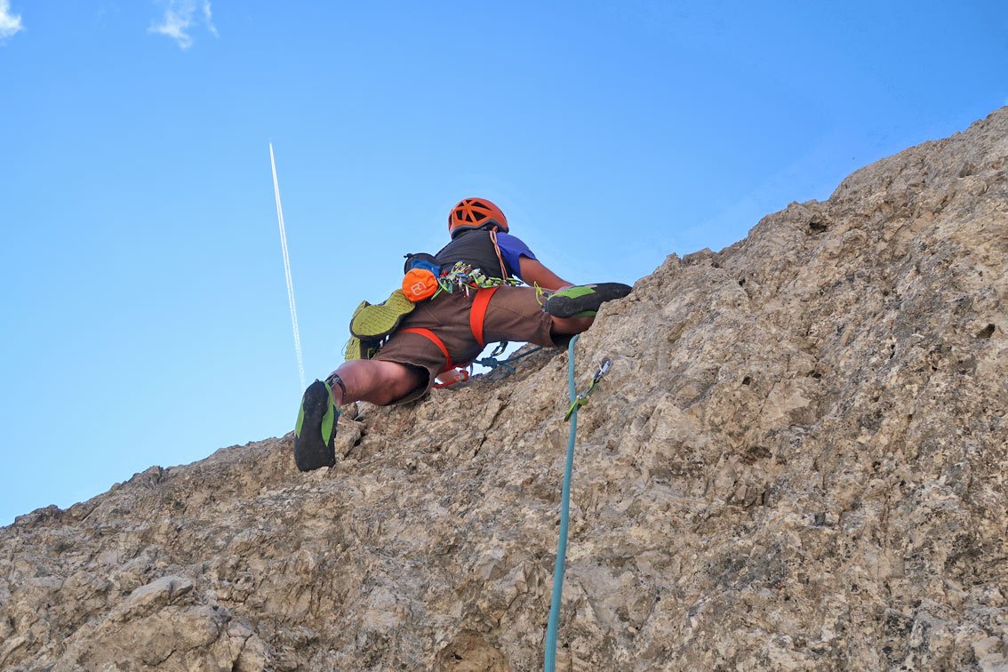 Tolle, griffige Tour, welche für Dolomitenverhältnisse auch recht gut abgesichert ist. Man klettert immer an steilem, löchrigem Kalk recht ausgesetzt an der Nordseite des Daumens der Fünffingerspitze hinauf. Die Tour ist wirklich Klasse und eignet sich wegen der Kürze auch für nicht ganz so wetterstabile Tourentage. Wer mit der Seilbahn hinauf fährt, kann sich auch über einen super kurzen Zustieg freuen.