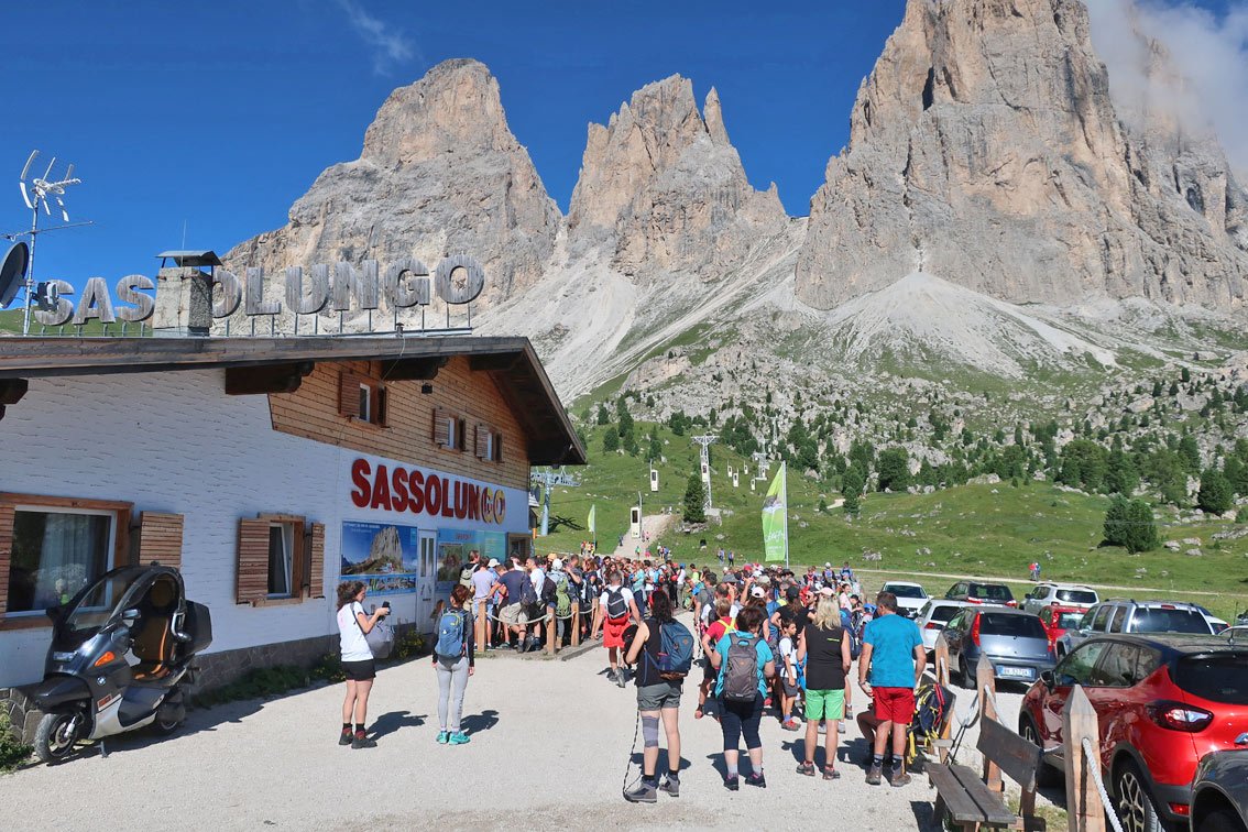 Auf der Brennerautobahn nach Klausen und dort weiter nach Gröden. Von dort hinauf auf den Sella Pass - westlich unterhalb des Sellapasses bei der Seilbahn zur Langkofelscharte parken. Öffis: Mit der Bahn nach Klausen und mit dem Bus bis zur Talstation der Seilbahn zur Langkofelscharte.