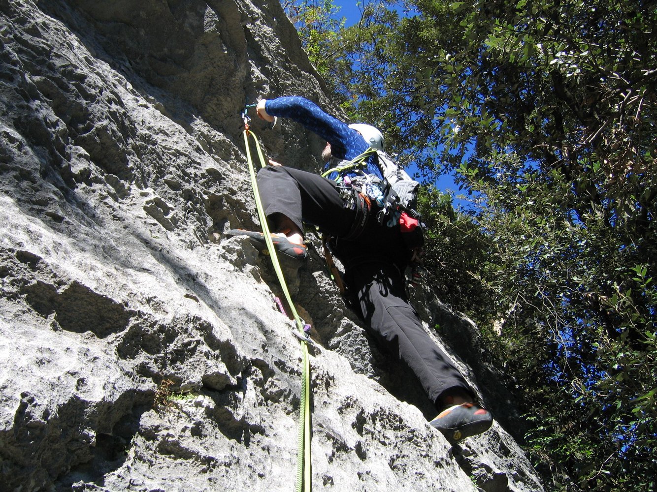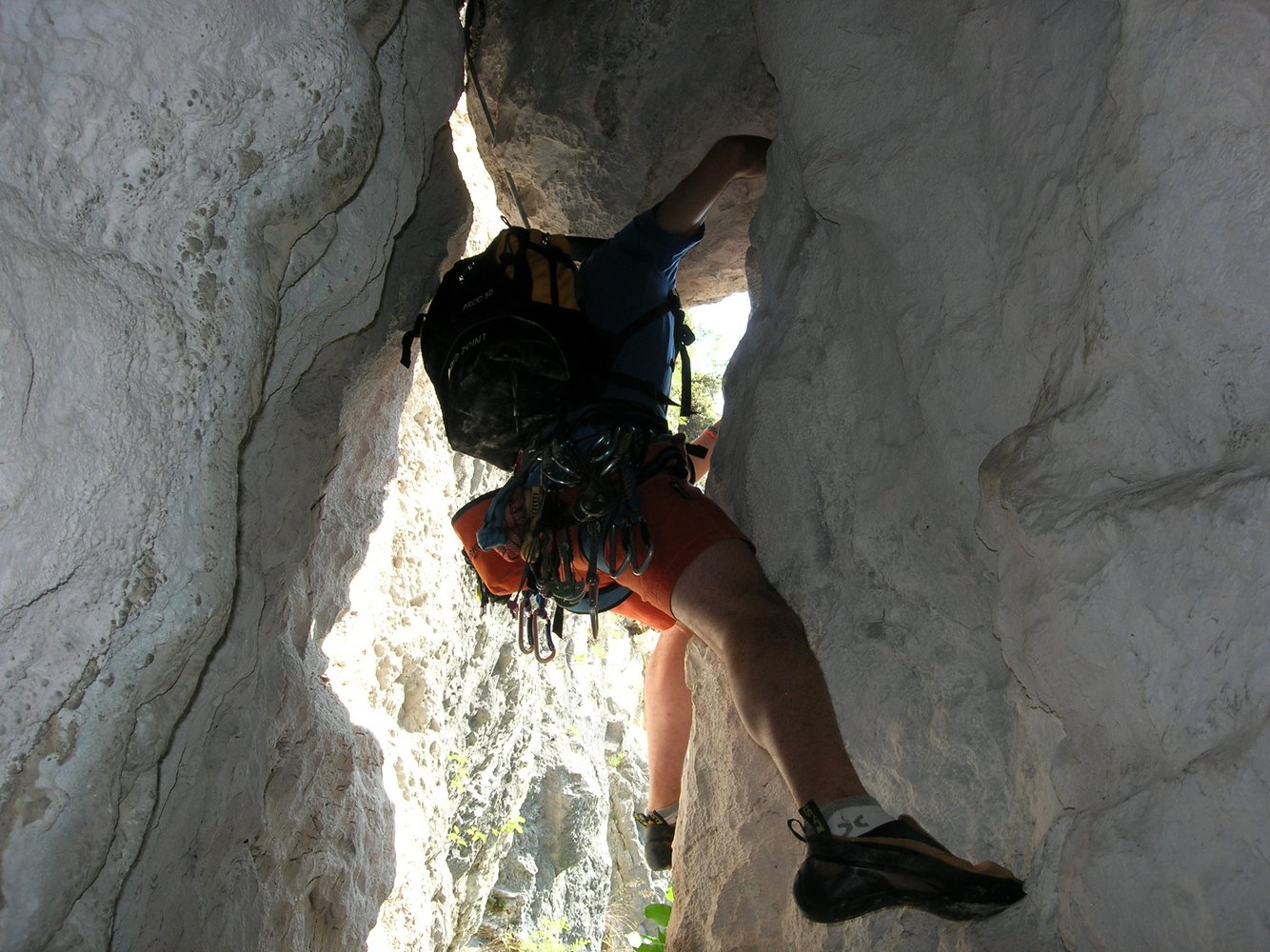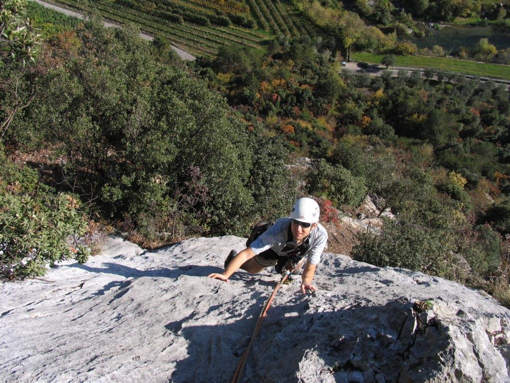 Ca. 100 Meter vor der Pizzeria Lanterna links in den Wald und auf einem kleinen Pfad zum Einstieg der Via Adonis (beschriftet) und links über Holzstufen hinauf zum Einstieg beim Kamin.