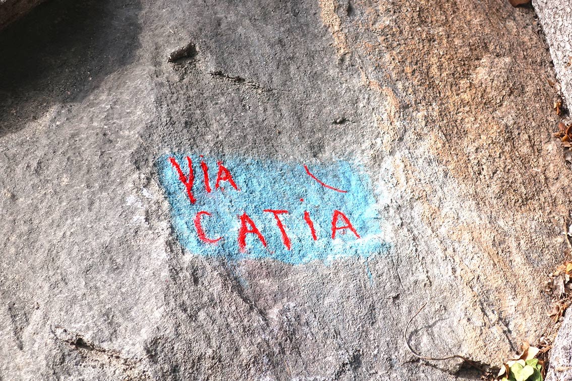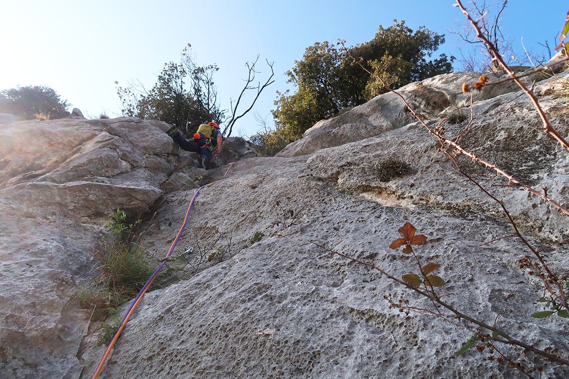 Vom Parkplatz zur römischen Brücke und von dieser links in Richtung Monte Colt. Gleich nach den Oliven-Terrassen aber nicht rechts weiter, sondern gerade auf dem Forstweg in den Wald. Nach wenigen Minuten zweigt rechts ein Pfad ab, dem man aufwärts bis zum Klettergarten folgt. Vom Klettergarten der Wand entlang bis zum Einstieg (ist angeschrieben).