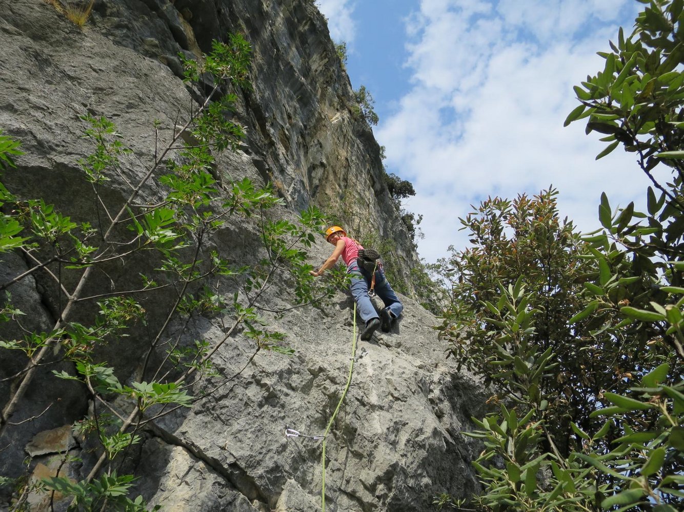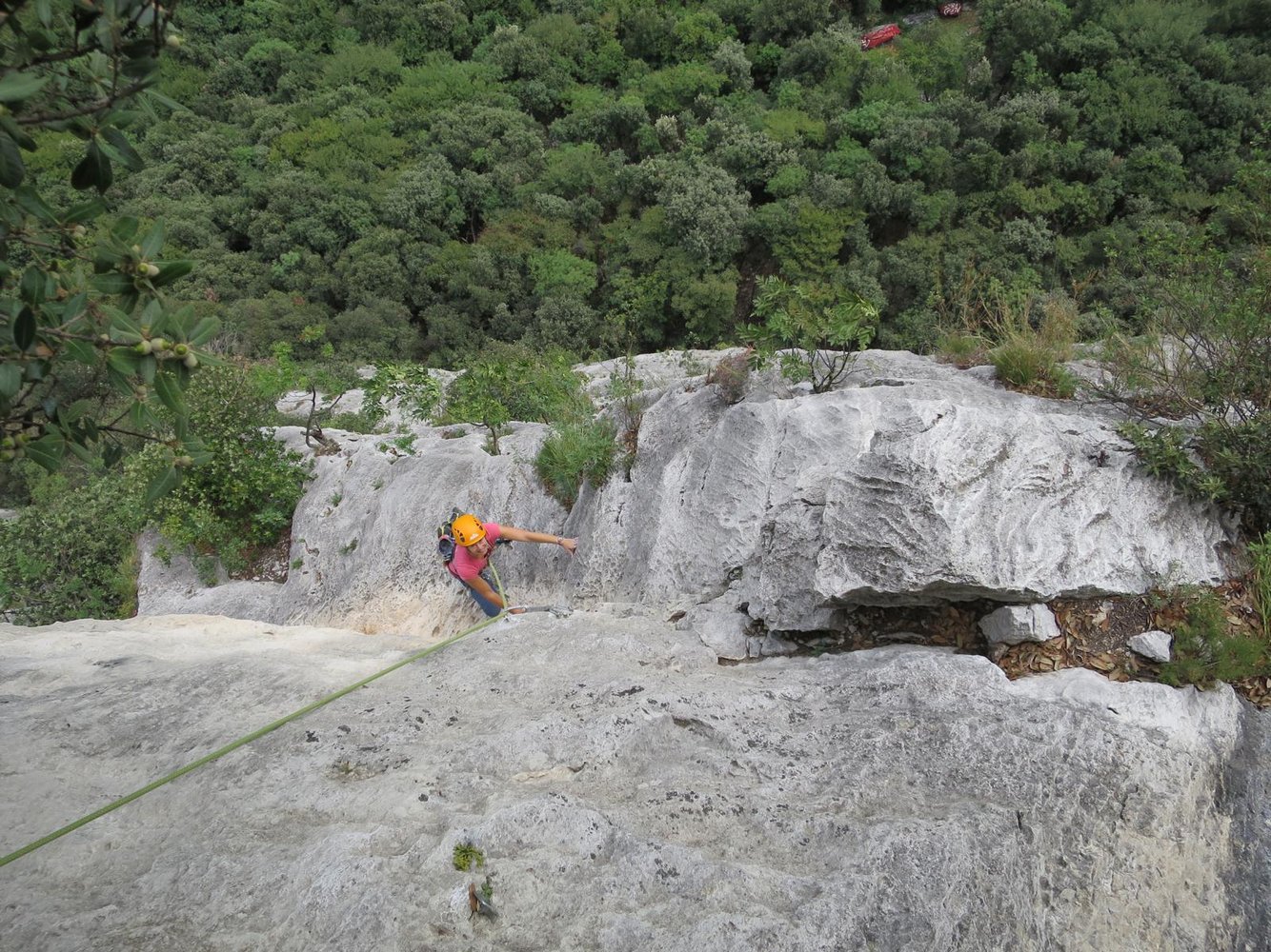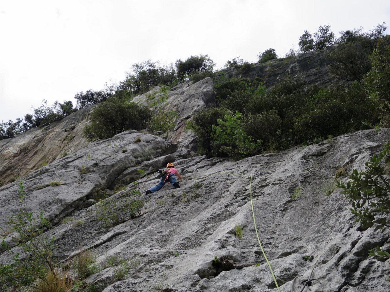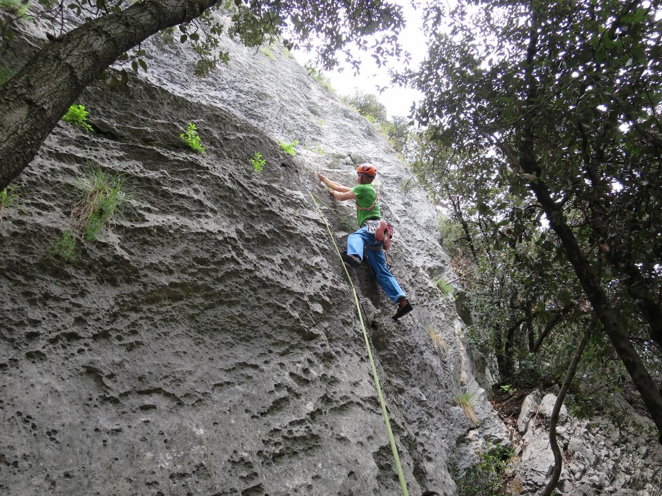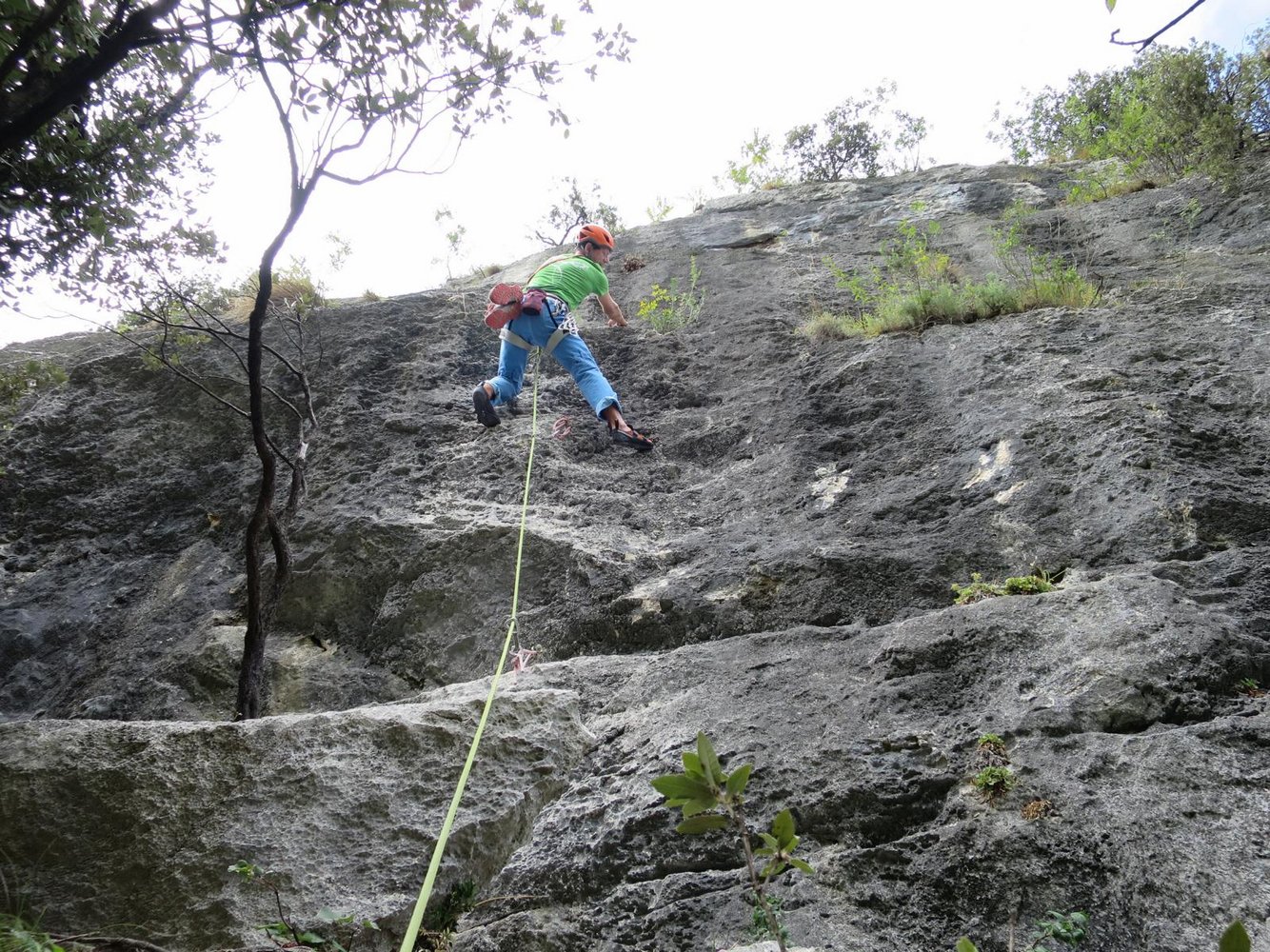 An den Standplätzen zwei Bohrhaken, die letzten zwei Stände an Büschen oder Bäumen. Die Route ist sehr gut abgesichert!
