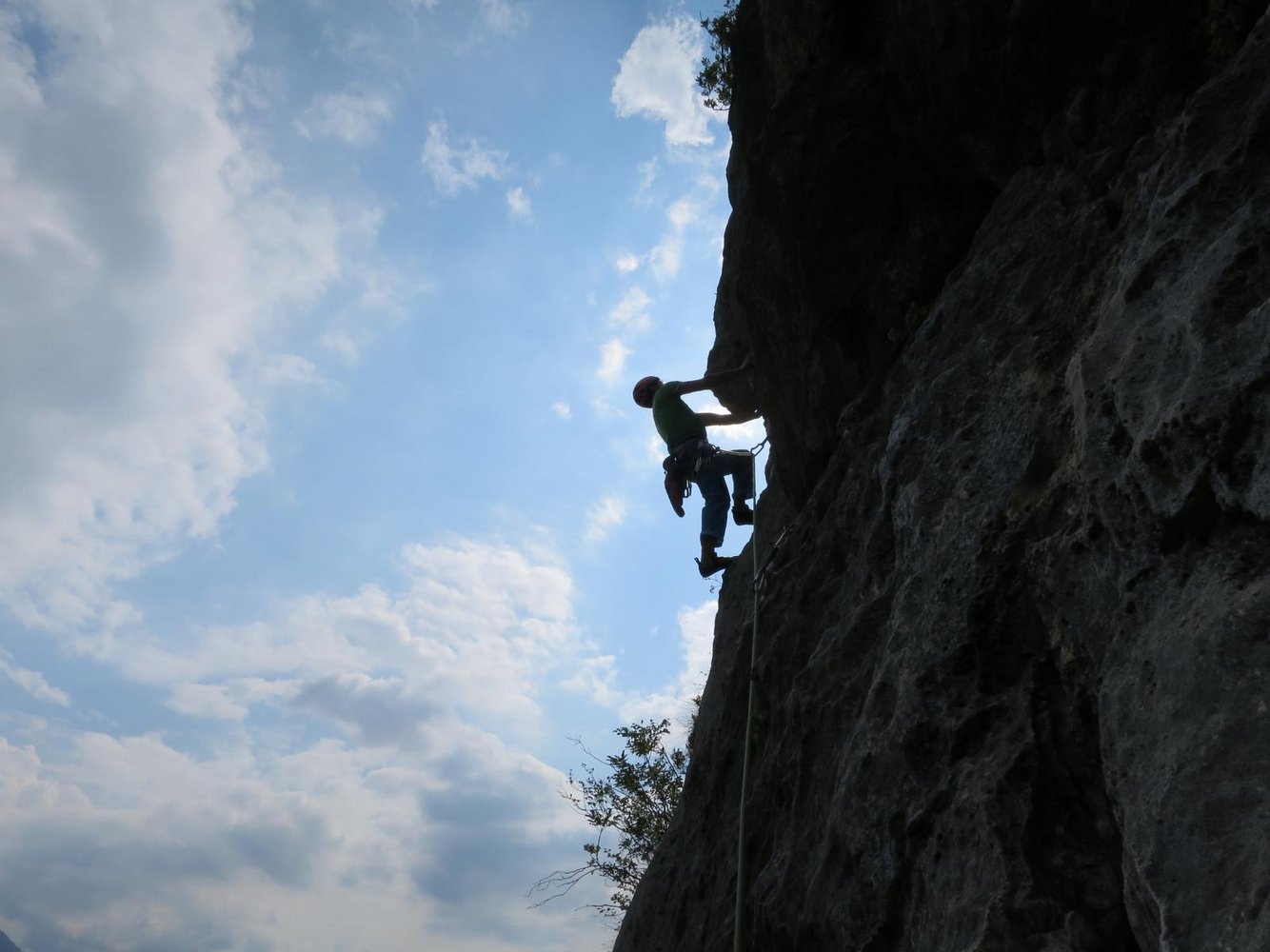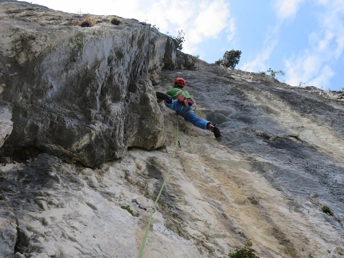 Schöne, homogene Kletterei, die nach oben hin stressfreier wird, denn der direkte Einstieg zur "Giu delle Brande" ist fast nur mit alten Sanduhrschlingen gesichert. Wer sich jedoch bis zur Hälfte psychisch "durchkämpft" wird sich über die großartige Piazverschneidung stressfrei freuen. Von der Kletterei her sind die vier Einstiegslängen aber lohnend.