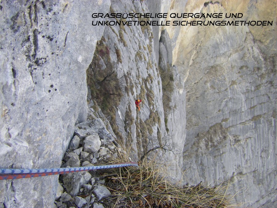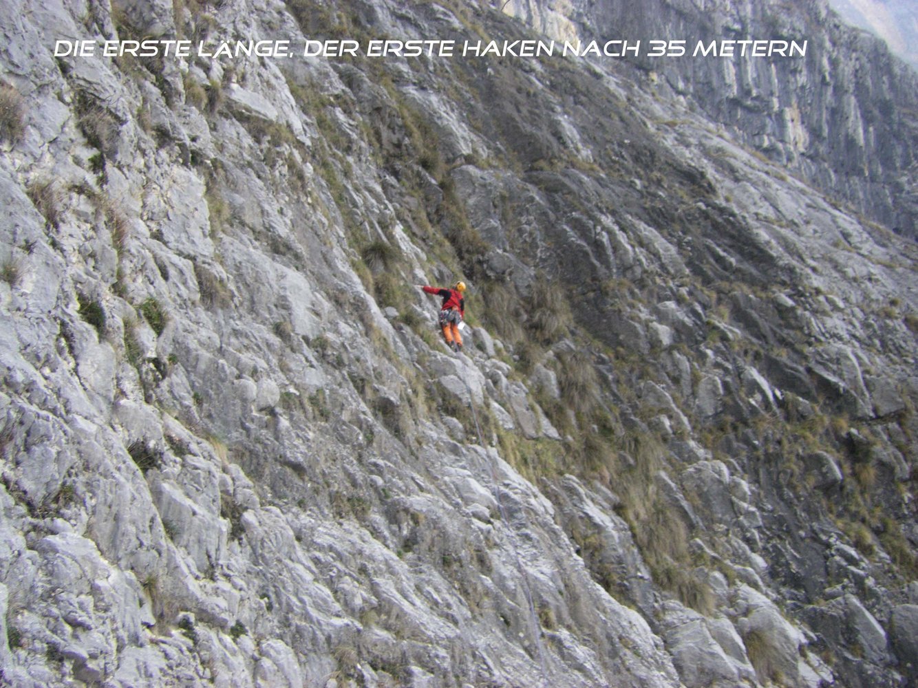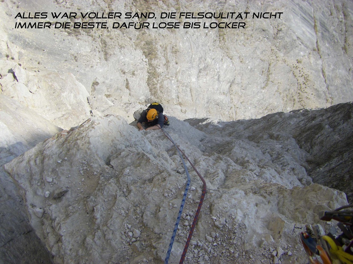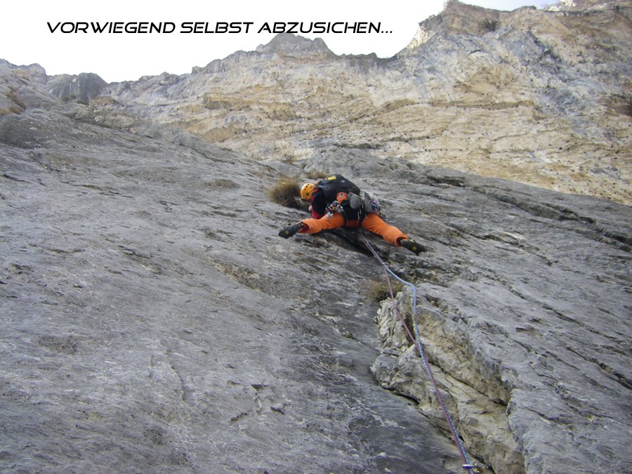 Siehe Topo - Die Route kann in drei Abschnitte gegliedert werden: Unten die sehr sandige und steinschlaggefährdete Zustiegsverschneidung, dann ein mehrere 100 Meter langer Gruft-Kamin, hier ist eher alles sehr lose, dafür aber steil und brüchig, und zuletzt steile Platten mit Piazschuppen und Rissen, meist völlig ohne Material versehen, dafür schön hohl, unzuverlässig, zwischendurch gepeppt mit grasbüscheligen Quergängen die zum Glück garnicht sicherbar sind, also kommt auch keine Panik wegen schlechter Haken auf. Richtig viel Material steckt in der A1 Abschlußverschneidung, die Siftborhaken von 1974 leißen sich mit der Hand noch nicht entfernen, dürften einen Sturz aber kaum halten können.