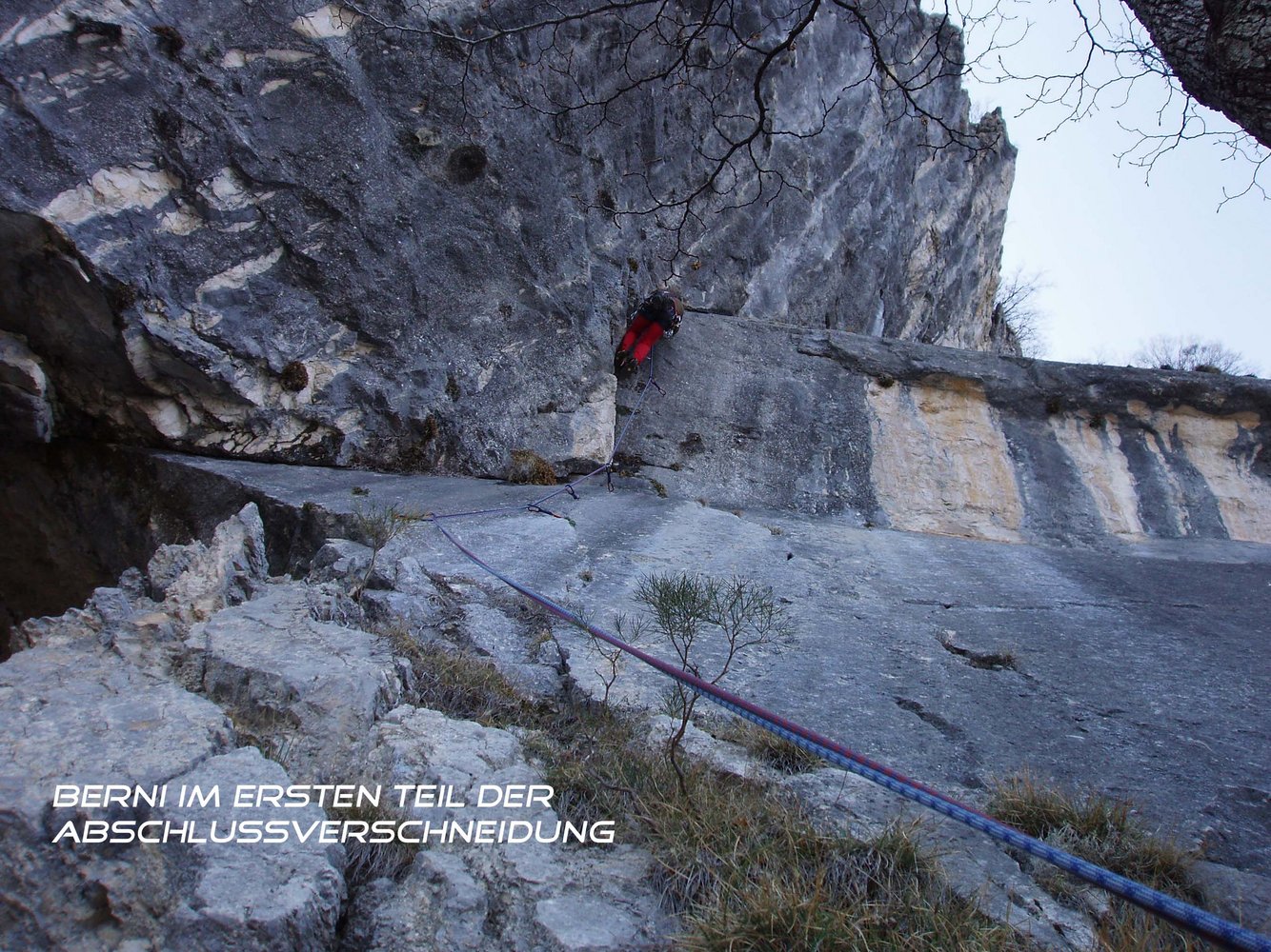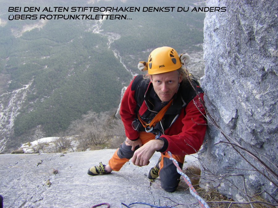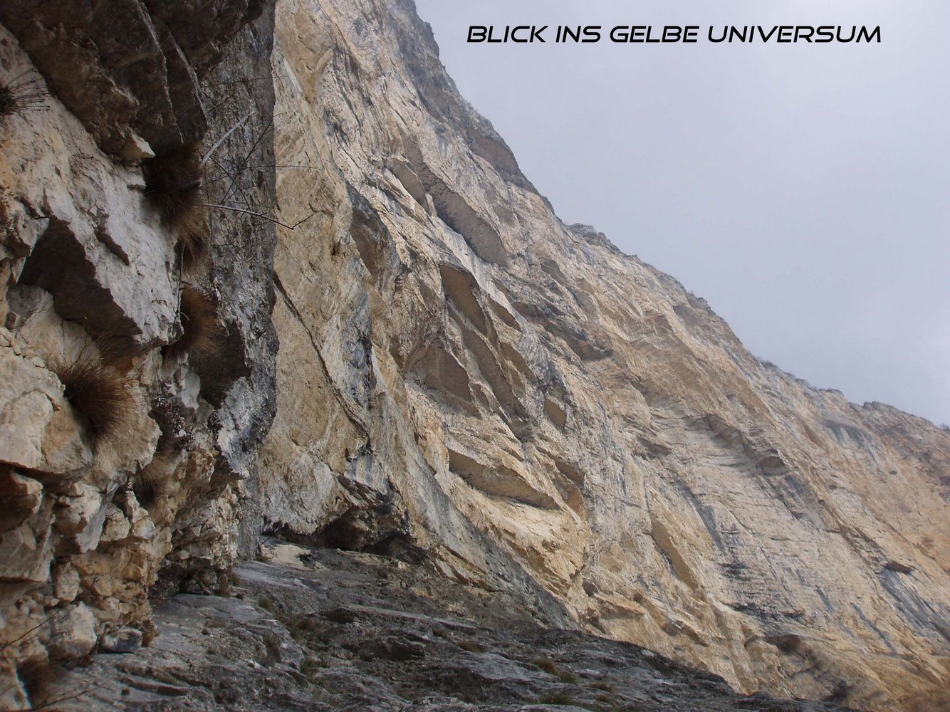 Kaum ein Kletterer kennt nicht die Sonnenplatten zwischen Dro und Pietramurata, und wer die Bar Zebrate noch nicht besucht hat um die dortige Choccolata calda zu genießen hat im Leben was verpasst. Da sitzt der Kletterer also vor der Bar, und wenn er (oder sie) so hinaufschaut, die Platten mit Augen absuchend, vielleicht um Kletterer in der eben selbst gemachten Tour zu beobachten („boah, is des da vielleicht steil,…naja, an der Stelle haben wir aber nicht so lang rumgemacht…“) oder sich darüber aufzuregen wie man da überhaupt noch klettern kann („wie kann man den flachen scheiß da bloß klettern…), unweigerlich wird der Blick dann höher schweifen, zu den riesigen Dächern der gelben Wand über den plötzlich winzig anmutenden Sonnenplatten.