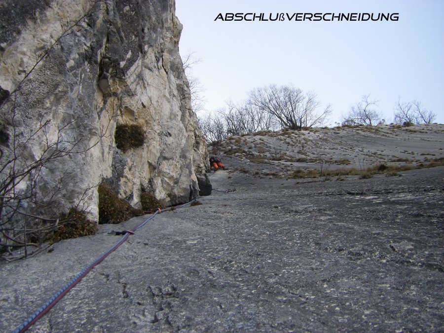 In der Tat, die sind gerade mal 400 Meter hoch und der Einstieg in die eigentliche Ostwand des Monte Brento liegt noch über den Ausstiegen der Sonnenplatten, um nochmals 1000 Meter höher mit einem kessen Hörnchen zu enden, von dem sich die Basejumper ins Leere stürzen. Es soll einer der besten Sprünge Europas sein, und relativ sicher obendrein, immerhin hängt die Wand auf den letzten 600 Metern konsequent über, und zwar 120 Meter weit. Der Springer hat also 1000 Meter Flug Zeit den Schirm aufzubekommen bevor der erste Bodenkontakt droht.
