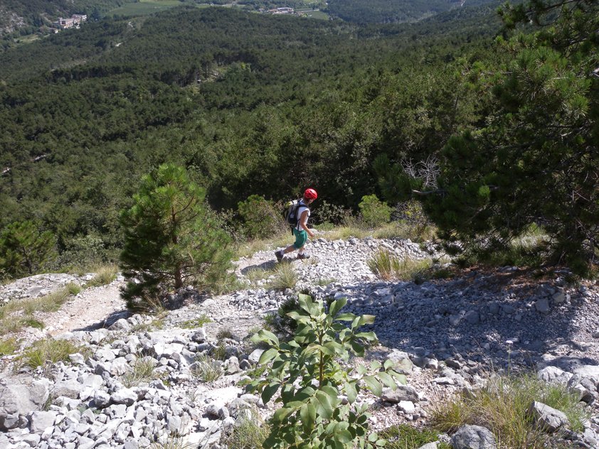Vom Ende der Tour nach links auf dem Abstiegspfad absteigen. Man kommt beim Einstieg wieder vorbei und steigt auf dem Zustiegsweg zum Parkplatz ab. Vorsicht: Keinen Steinschlag beim Abstieg auslösen!