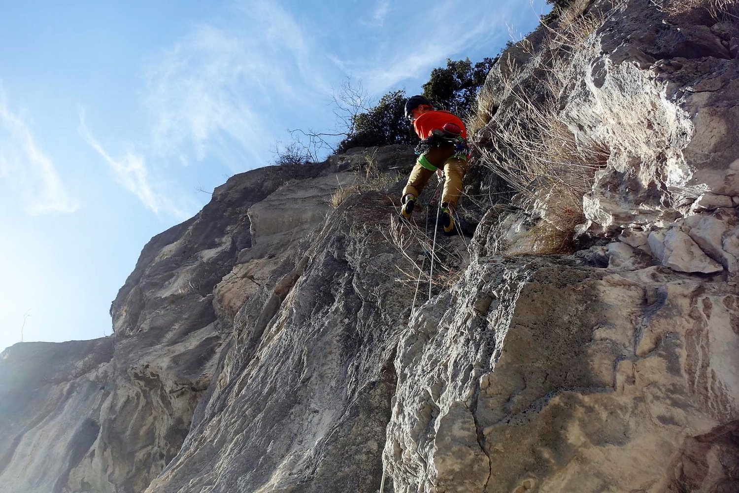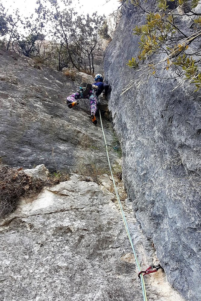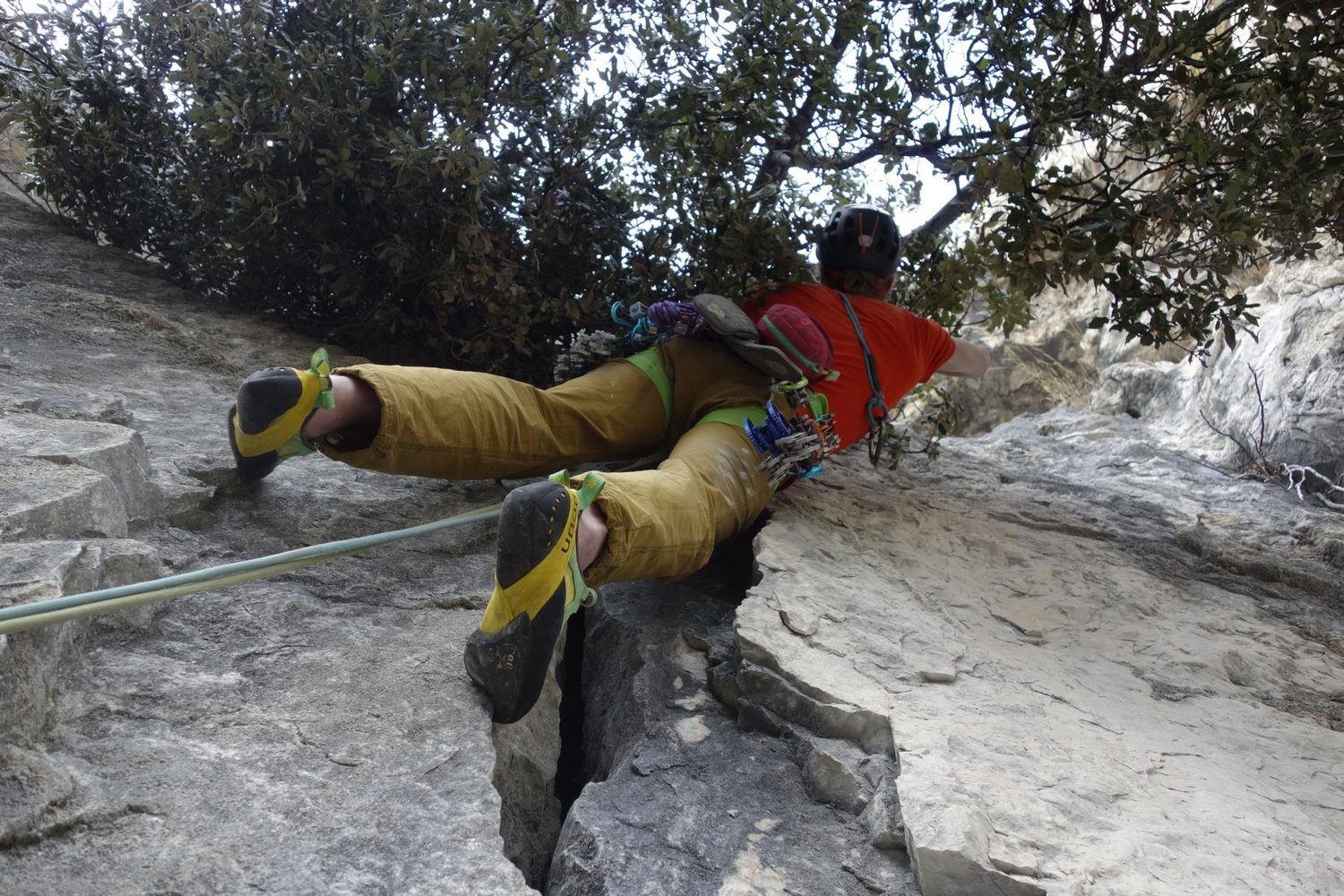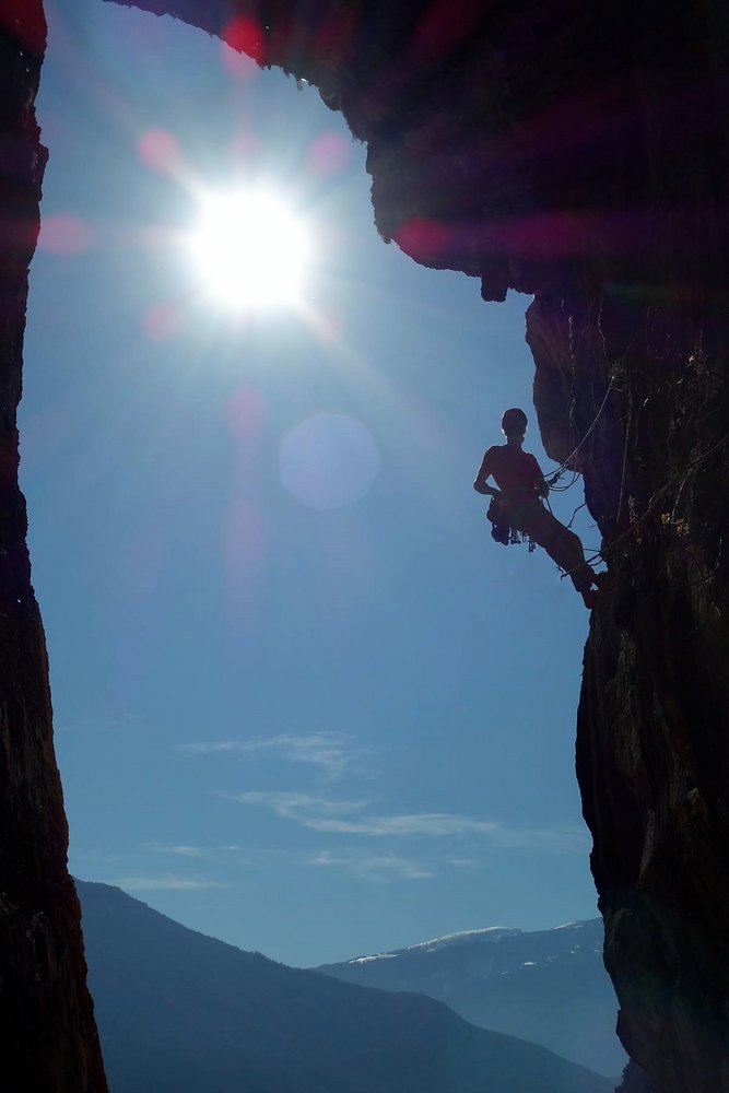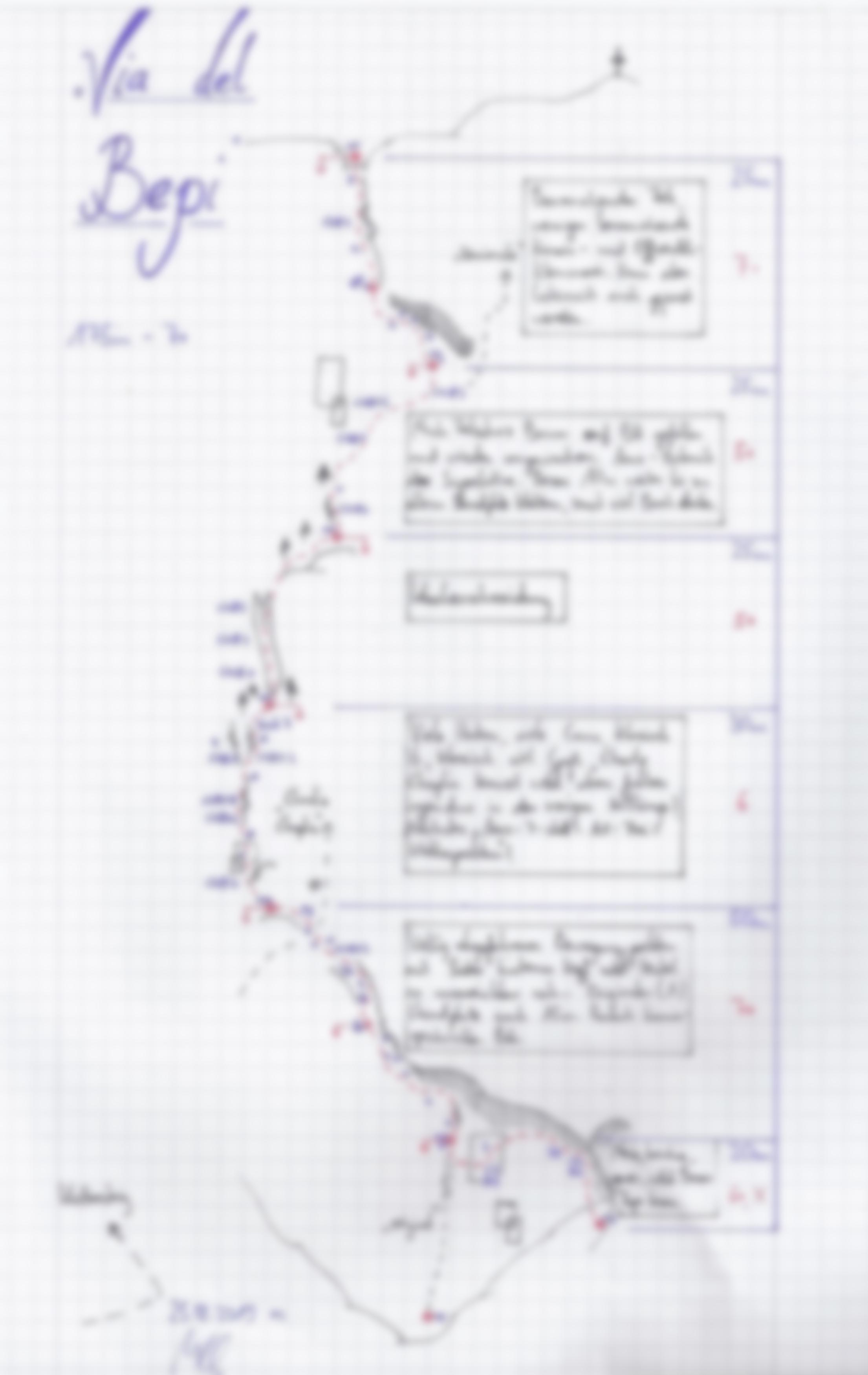 Die Via del Bepi steht zu Unrecht im Schatten der Colodri-Superklassiker im selben Grad. Exzellente schmale Risse, exzessiv breite Risse, wenig Gemüse (wenn dann, aber so richtig), jeder Standplatz mit mindestens 2 gebohrten Ringen versehen, eine völlig verrückte Schlüsselstelle und dank unserer Topo-Lesen-Verweigerungsstrategie um eine "Variante di entrata" reicher.