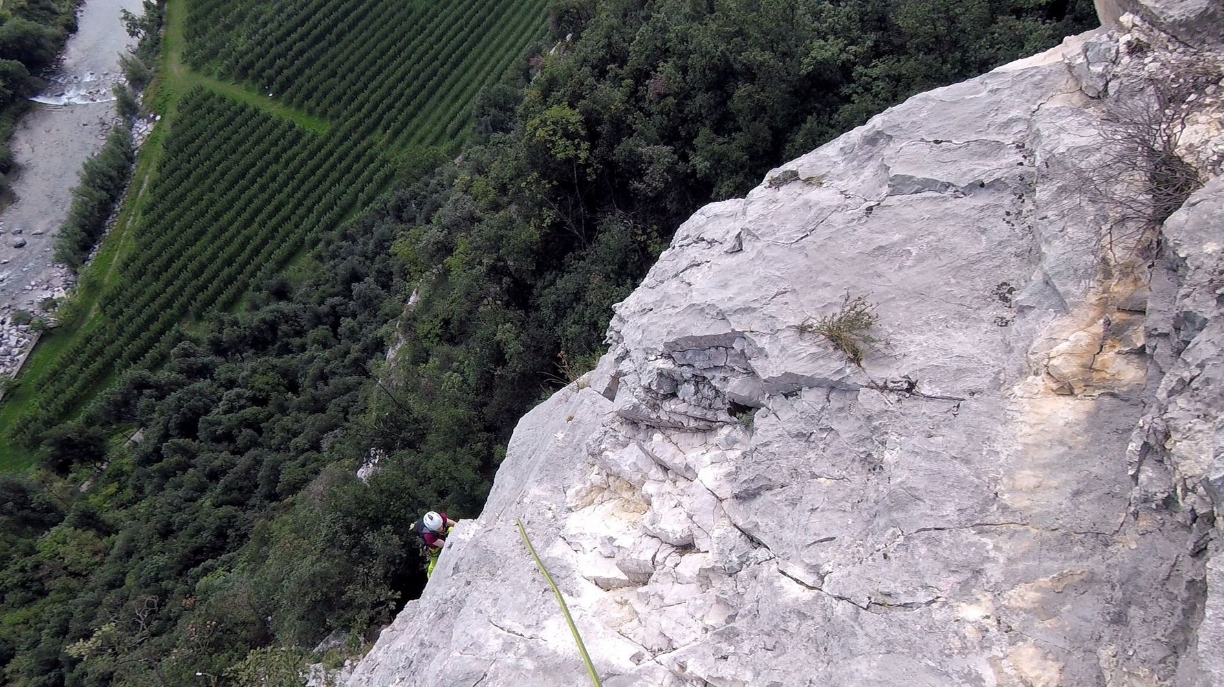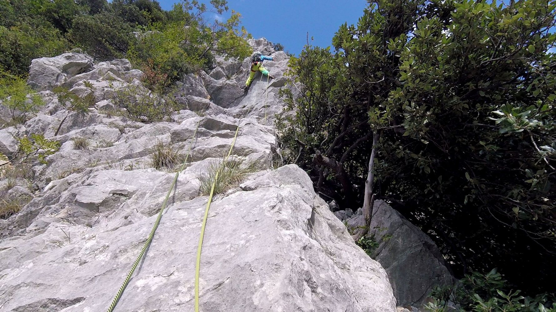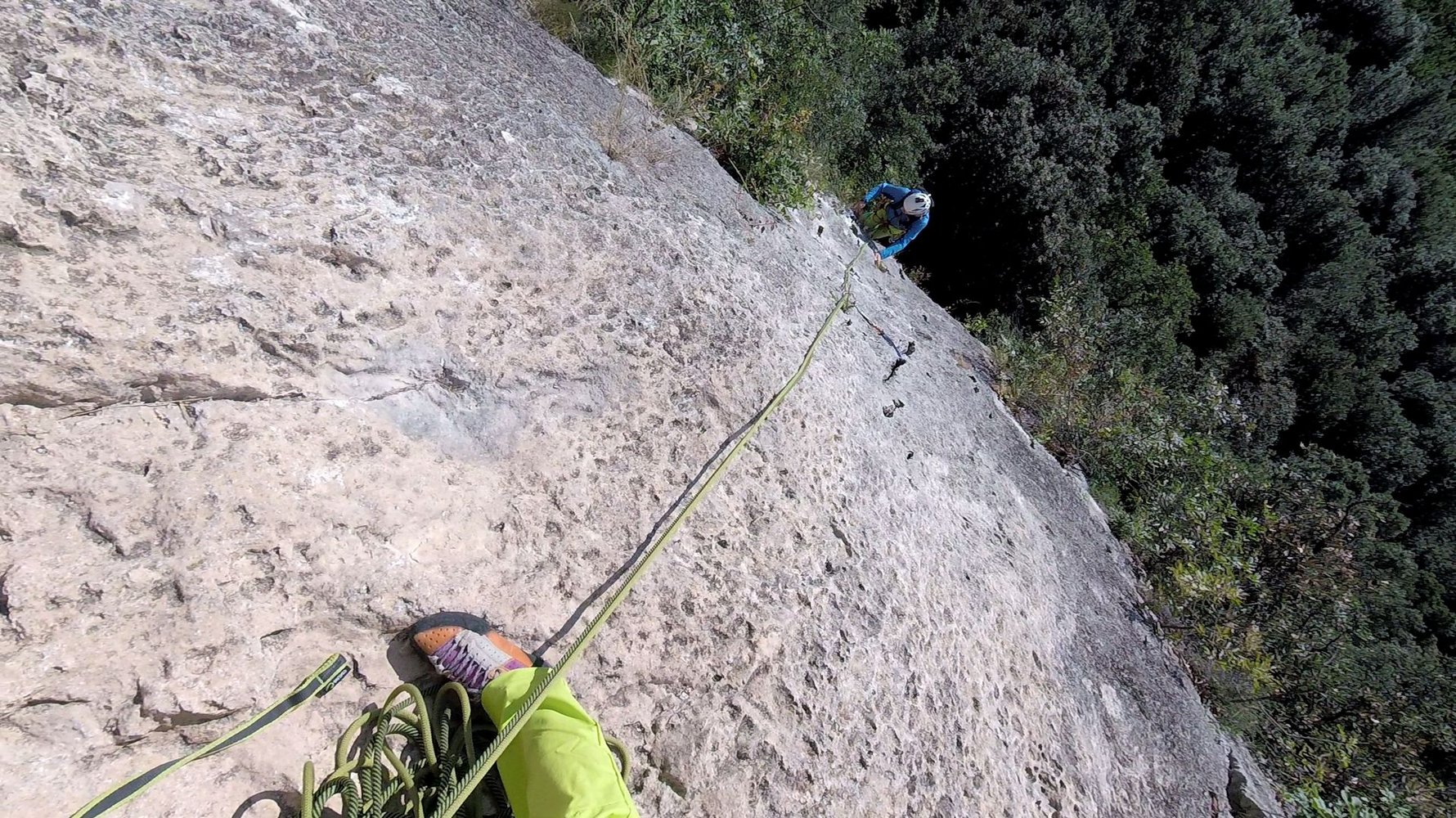 60 m Einfachseil, 10 Expressschlingen, Bandschlingen für Sanduhren und Baumstände, evtl. ein paar mittlere Friends, sowie einen Helm.