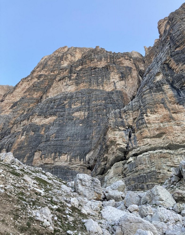 Vom Rifugio Angelo Dibona auf dem Weg 403, beim Materialaufzug aber links, direkt hinauf an den Wandfuß der mächtigen Tofana Südwände, wo man man auf den Querweg (404) trifft. Diesem folgt man nach Westen bis in Falllinie des großen Amphitheaters der Südwand. Unbegrünte Schuttrippen passieren, weiter westlich erst die leicht begrünte Rippe rechts vom Weg abzweigend ansteigen, zuletzt über Schutt hinauf zur Grotte mit großem weißen Klemmblock (siehe Photos).