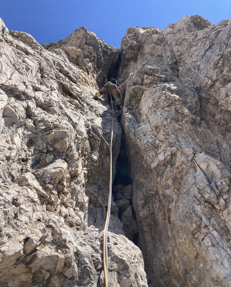 Nach dem Ende der Kletterei wartet noch ein längeres seilfreies Gehen im Schutt bis UIAA 2 erst auf der Rippe zum Vorgipfel, danach Trittspuren folgend zum Gipfel. Zuletzt wahlweise schuttig Queren durch die Westflanke zum Normalweg oder brüchig entlang Trittspuren zu einer ca. 10m langen schuttig-brüchigen Steilrinne (Abstand halten, lose Blöcke!), aus welcher man direkt zum Gipfel aussteigt.