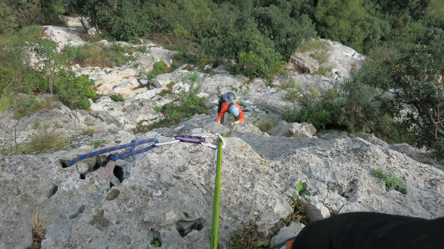 50 m Seil, 8 Expressschlingen, Bandschlingen für Sanduhren und Baumstände und einen Helm.