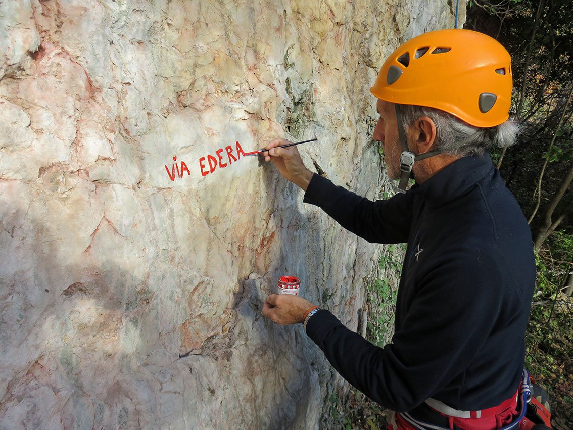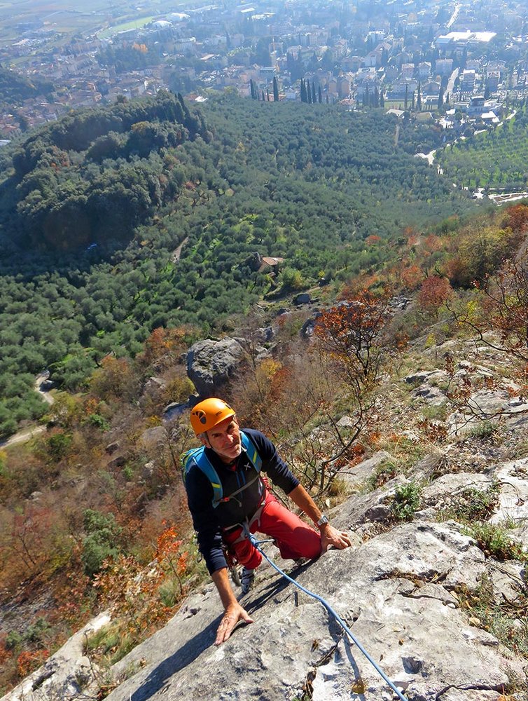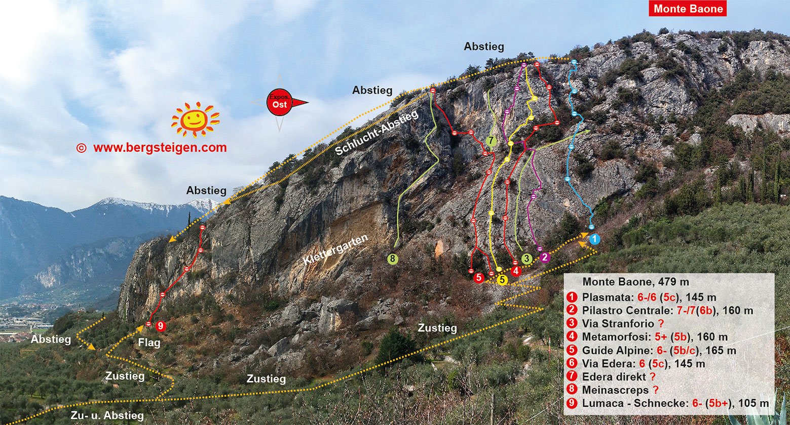 Die Via Edera ist eine neue, fast schon plaisirmäßig abgesicherte Linie an der Ostwand des Monte Baone. Nach einem steilen Beginn klettert man auf toll strukturierten, griffigen Platten aufwärts. Nach eine großen Rissschuppe erreicht man entlang der steileren Ausstiegswand das Ende der Route. Gut herausgearbeiteter Anstieg in gemäßigter Schwierigkeit - die Route wird bald ein beliebter Genussklassiker in Arco werden!