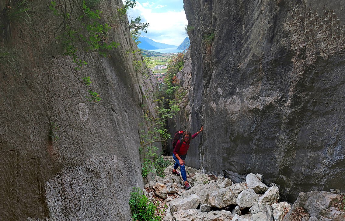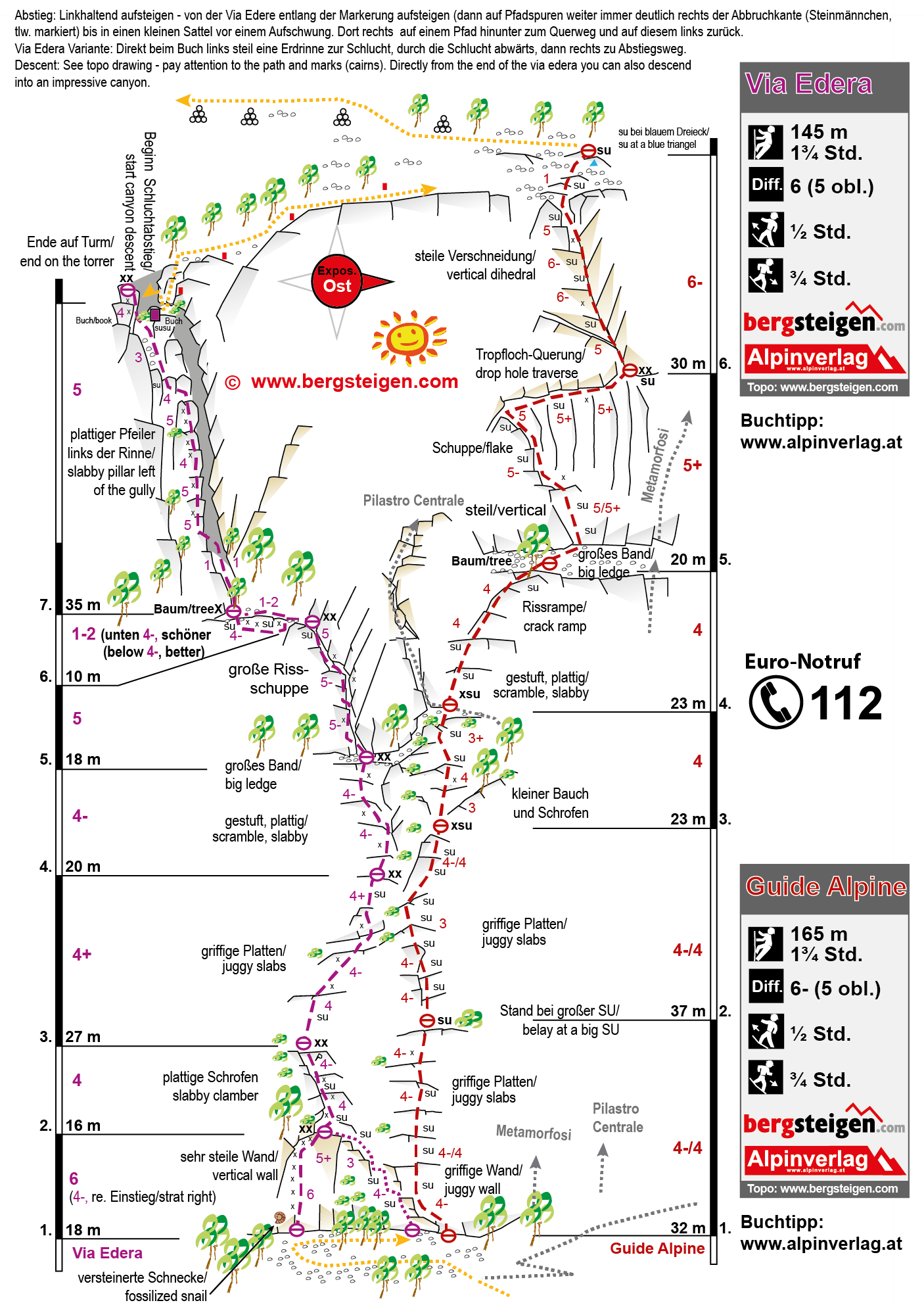 Tipp: Spannender ist folgende Variante: Vom Ausstieg der Via Edera gleich links eine kleine erdige Rinne hinunter in eine Schlucht absteigen. In der kleinen Schlucht mit zwei kurzen Steilstufen abwärts (1, eindrucksvolles Ambiente, unten ein großer Klemmblock unter dem man durchgeht!) und über Blockwerk rechts haltend auf den Südgrat. Dann im Bereich des Grates (Punktmarkierung) absteigen, wie oben. Bei Nässe ist die Schlucht nicht ideal.