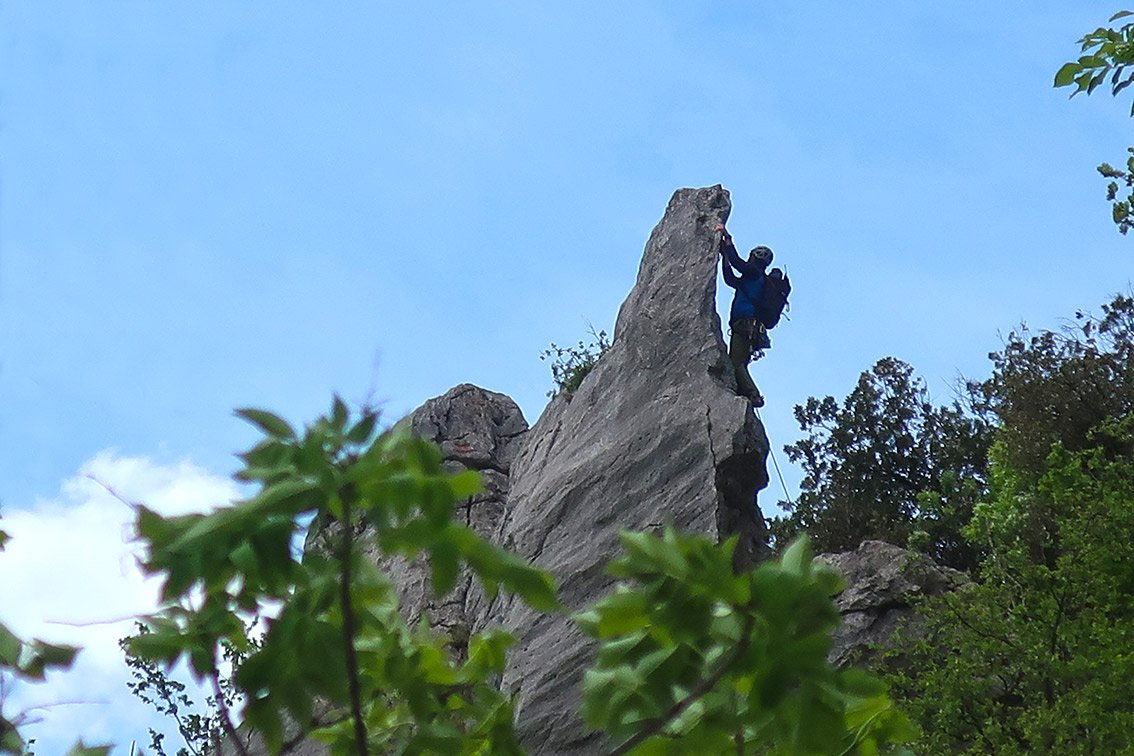 Die schwere Passage ist gleich zu Beginn der Route, diese ist mit vielen Bohrhaken gesichert.