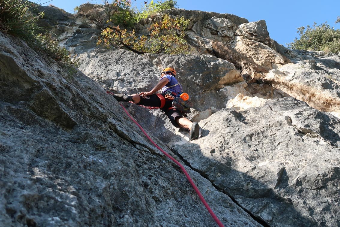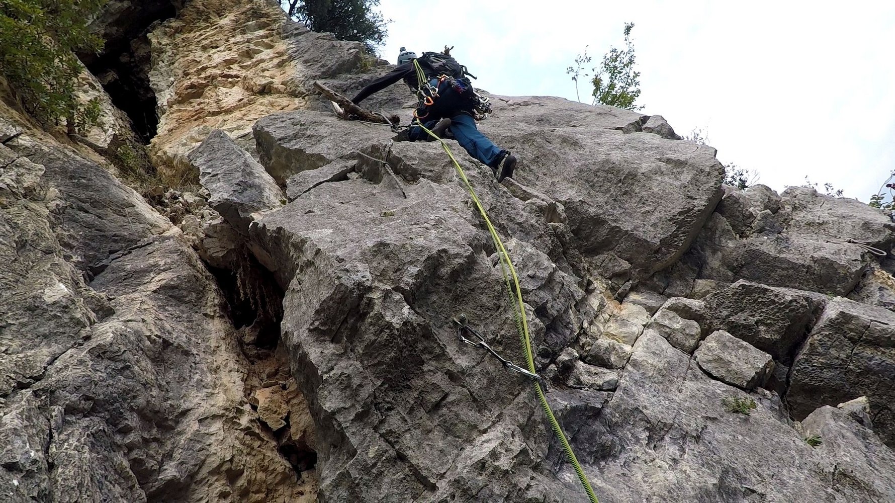 Die Absicherung ist gut (Bohrhaken und Sanduhrschlingen).